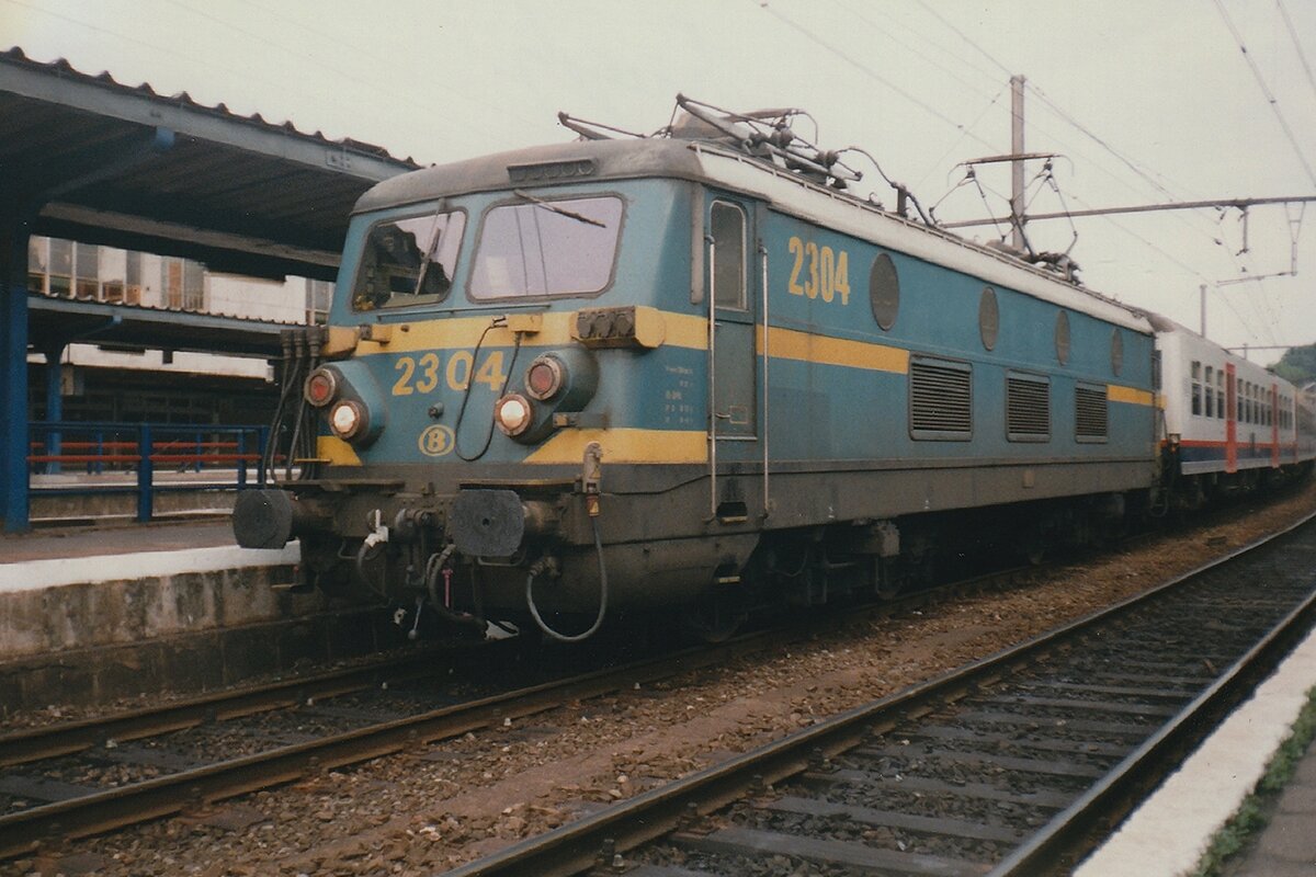Scanbild von ein Froschblick auf SNCB/NMBS 2304 mit Schnellzug nach namur in Lüttich-Guillemins am Abend von 13 Juli 1999.