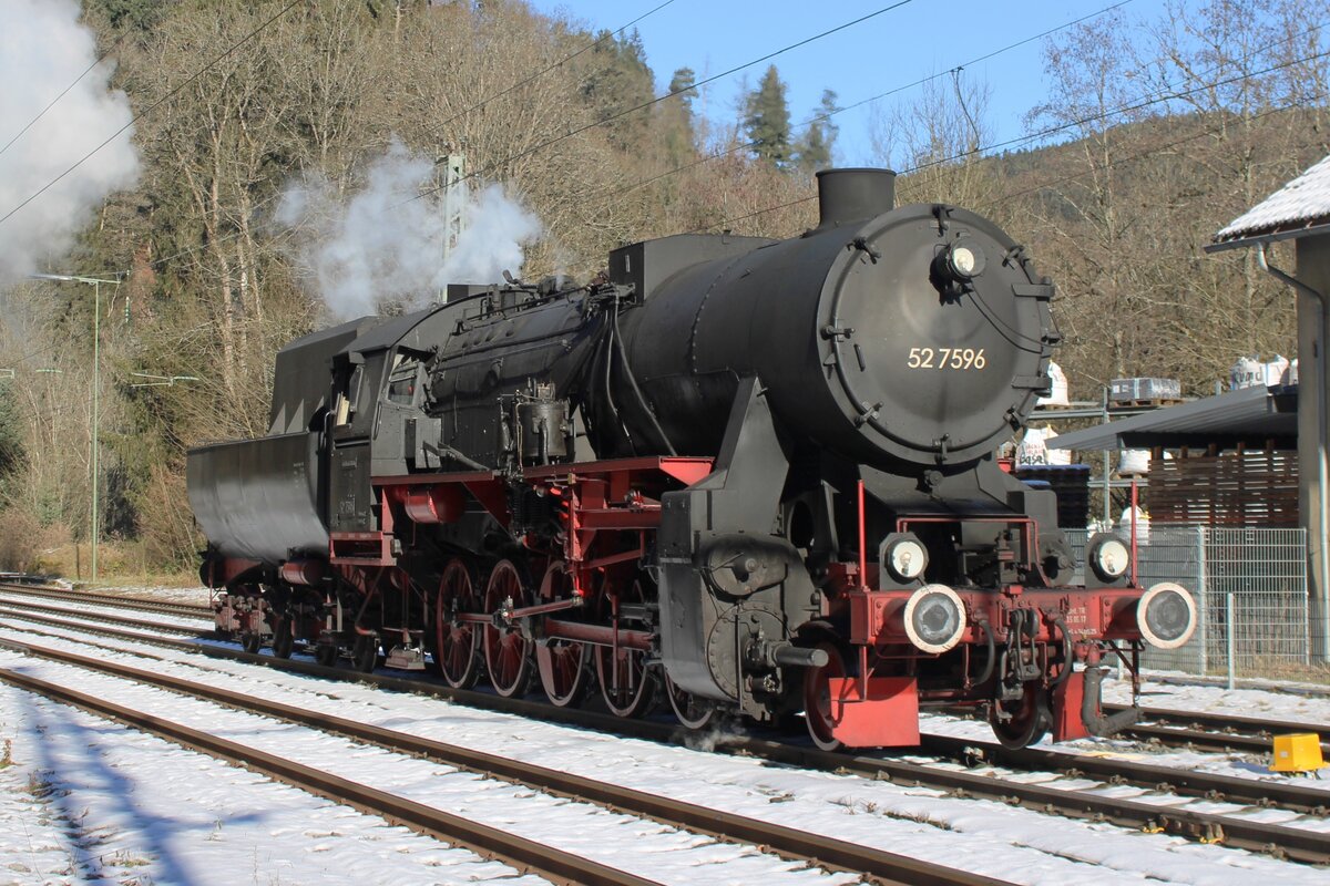 EFZ 52 7596 steht mit der Tunnelzug aus St.-Georgen und Triberg am 29 Dezember 2024 in Hausach. Weil in Triberg und St.-Georgen nicht genugend Platz ist um ein Dampfzug zu stationieren, wird den Pendelfahrt zwischen Triberg und St.-Georgen verlängert nach Hausach, wo das bahnhofaräa'ausreichend ist.