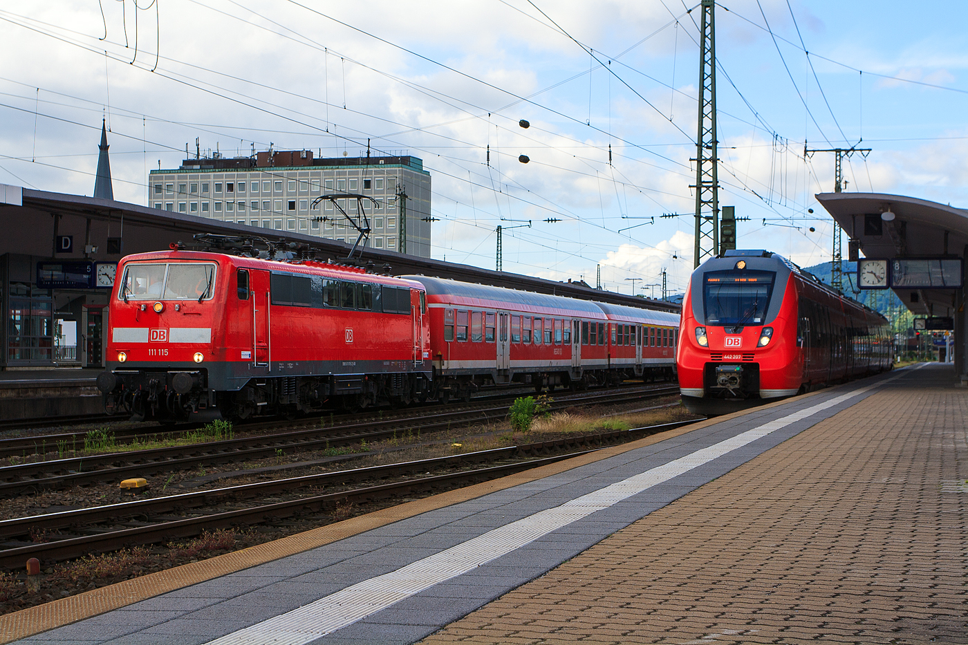 Die 111 115-2 (91 80 6111 115-2 D-DB) der DB Regio NRW mit einem mit n-Wagen-Zug (ex Silberlinge bzw. DB Nahverkehrs-Wagen) am 14 Juni 2013 im Hauptbahnhof Koblenz. Rechts steht der vierteilige Bombardier Talent 2 - 442 207 / 707 "Kobern-Gondorf" der DB Regio, als RB 81 "Moseltal-Bahn" (Koblenz - Cochem - Trier) zur Abfahrt bereit.