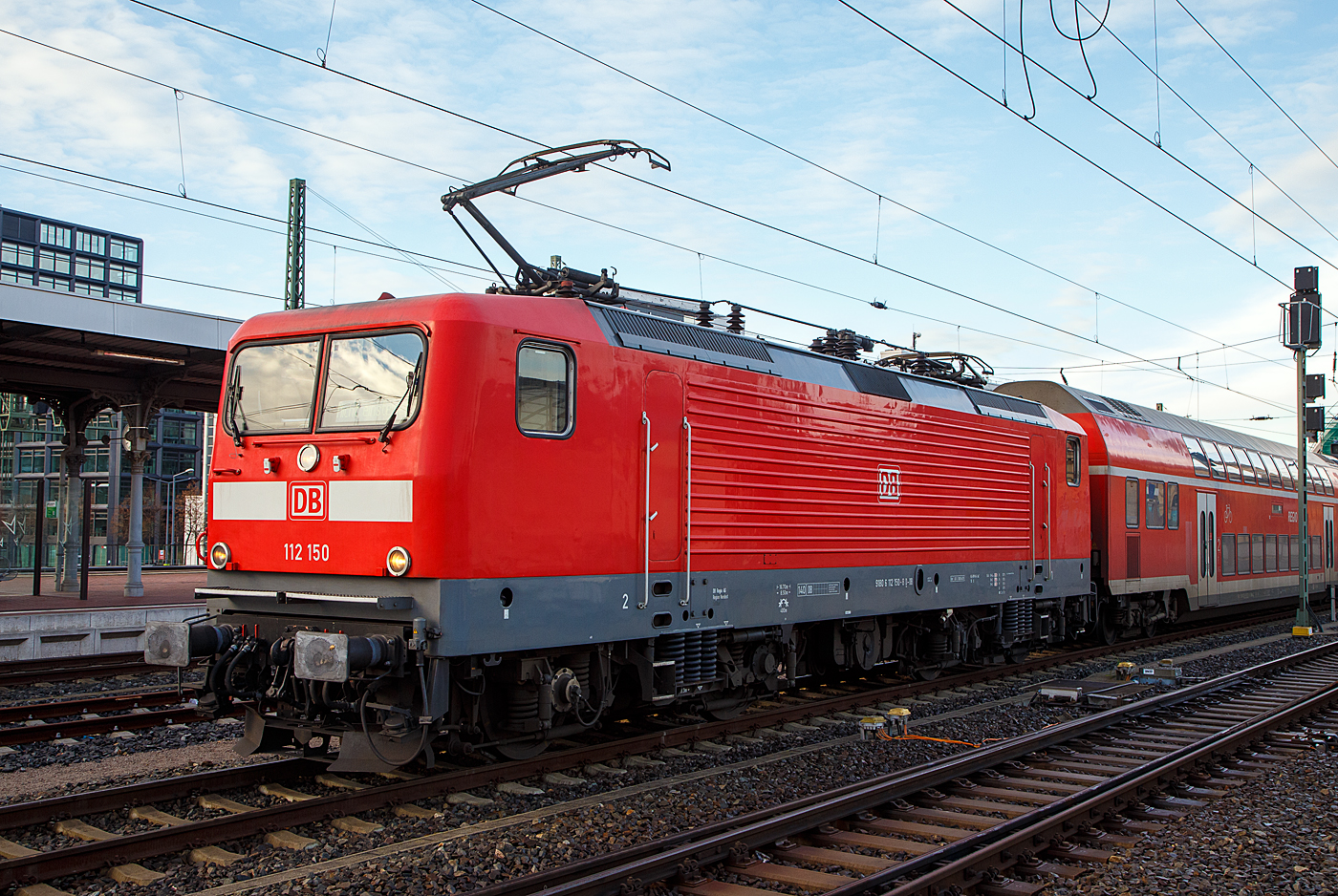 Die 112 150-8 (91 80 6112 150-8 D-DB) der DB Regio AG Nordost steht am 08.12.2022, mit einem Doppelstockzug im Hauptbahnhof Dresden.