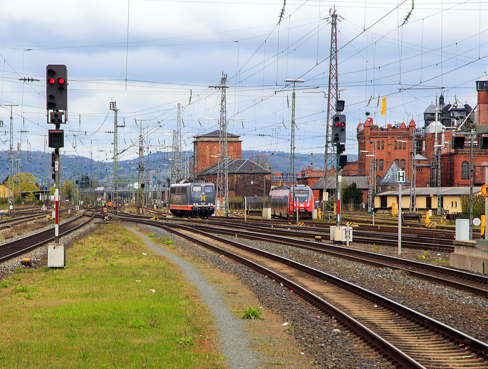 Der Stadler Regio-Shuttle RS1 - VT 650.724 (95 80 0650 724-7 D-AGIL) der agilis Verkehrsgesellschaft mbH & Co. KG (Regensburg) fährt am 17.04.2023 in dem Bahnhof Bamberg ein. Hinten steht die Hector Rail 162.007 „Beckert“ alias 151 134-4 (91 80 6151 134-4 D-HRDE).