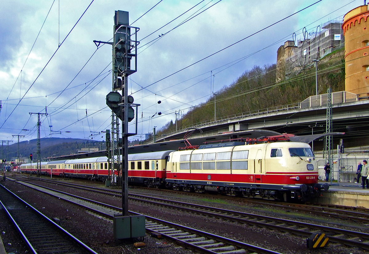 Die 103 235-8 (91 80 6103 235-8 D-DB) mit IC 91300 (mit TEE-Rheingold Wagen) steht am 03.04.2010 im Koblenzer Hauptbahnhof zur Weiterfahrt nach Trier Hbf bereit. Der Zug fuhr anlässlich des Dampfspektakels 2010. Der Sonderzug fuhr als TEE Rheingold die Verbindung Dortmund – Essen – Duisburg – Köln – Koblenz – Trier. Den Zug konnte man mit einem normalen IC-Ticket in der 2. Klasse buchen. Die Lok wurde 1973 von Henschel in Kassel unter der Fabriknummer 31782 gebaut, der elektrische Teil ist von BBC (Brown, Boveri & Cie AG).