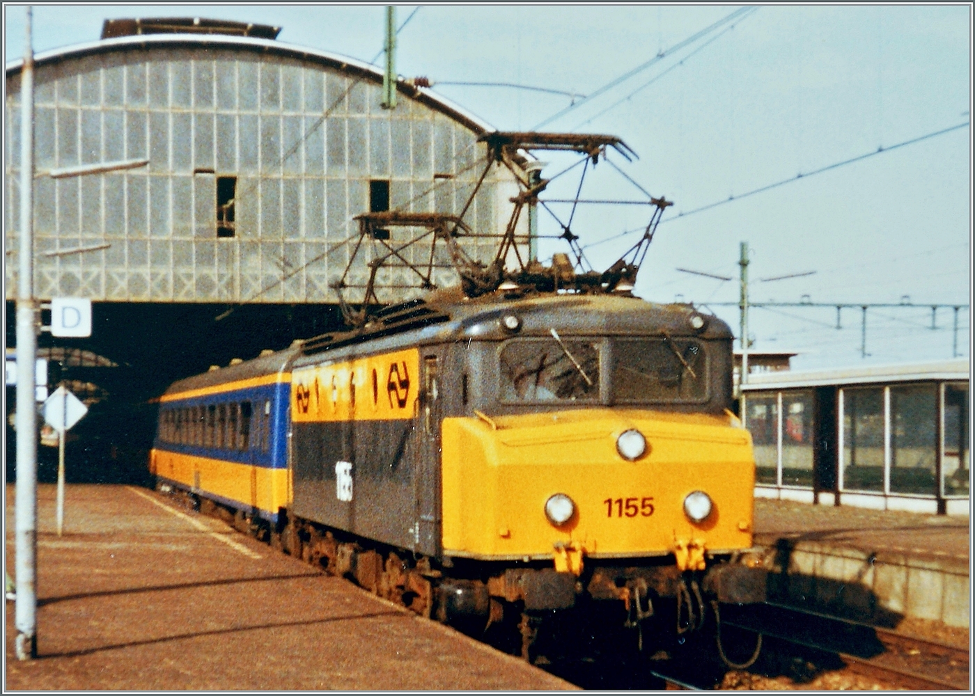 Obwohl bereist einige Bilder der NS 1100 mit Vorbei bei Hellertal.startbilder gezeigt wurden, möchte ich als Ergänzung zur Museums Lok der NS 1125 doch noch dieses Analog Bild mit der NS 1155 und den damals neuen Reisezugwagen hier zeigen. Das Bild entstand in Den Haag HS und die knappe Bildunterschrift lautet: IC nach Vlissingen. 10. Juni 1983