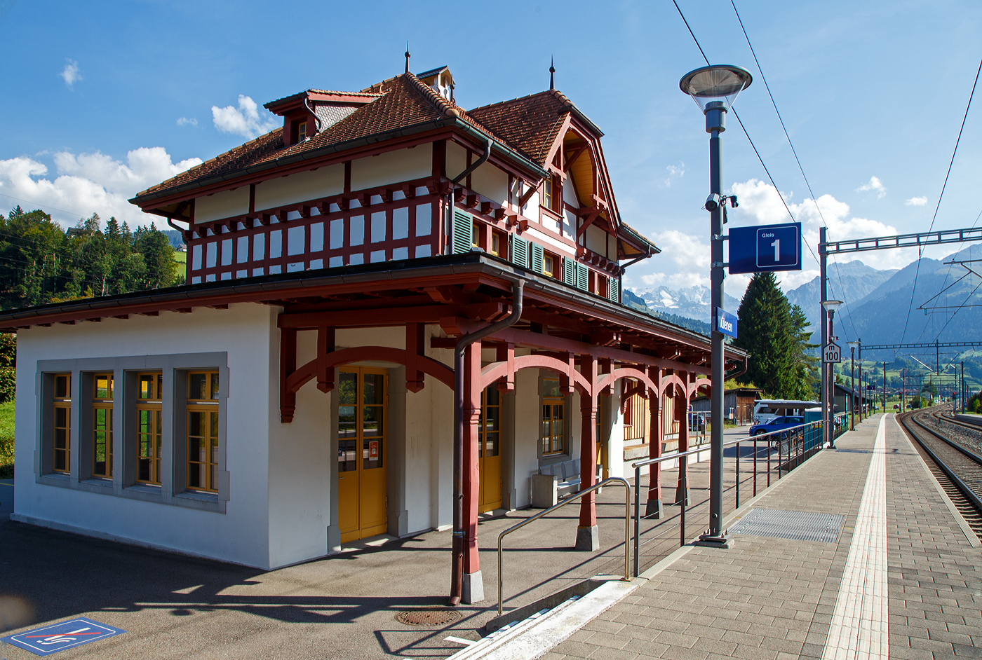 Empfangsgebäude vom BLS Bahnhof Mülenen am 08 September 2021, in südöstlicher Blickrichtung (Berneralpen/Lötschberg).