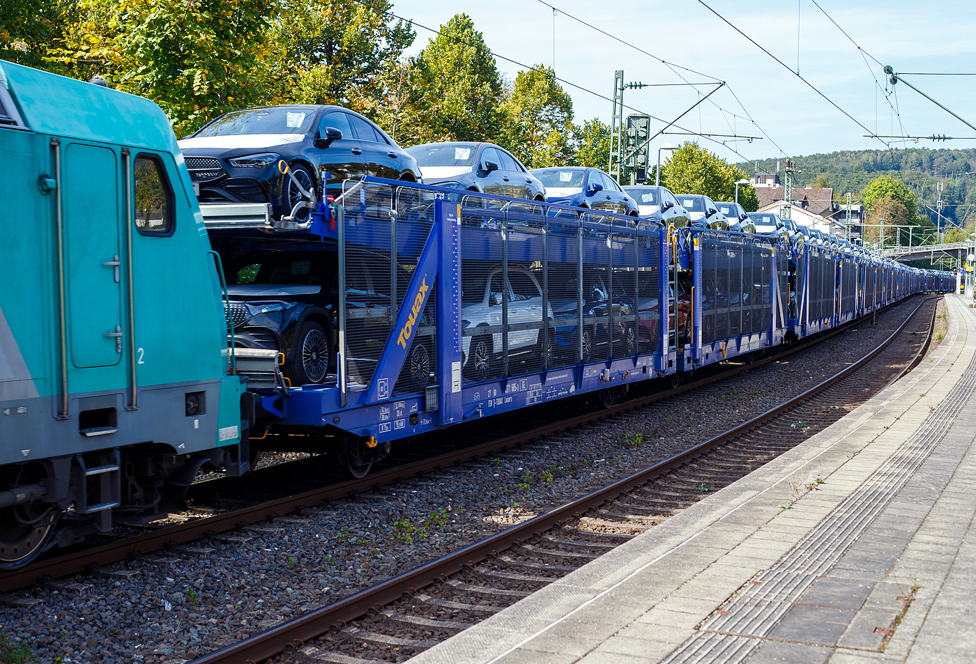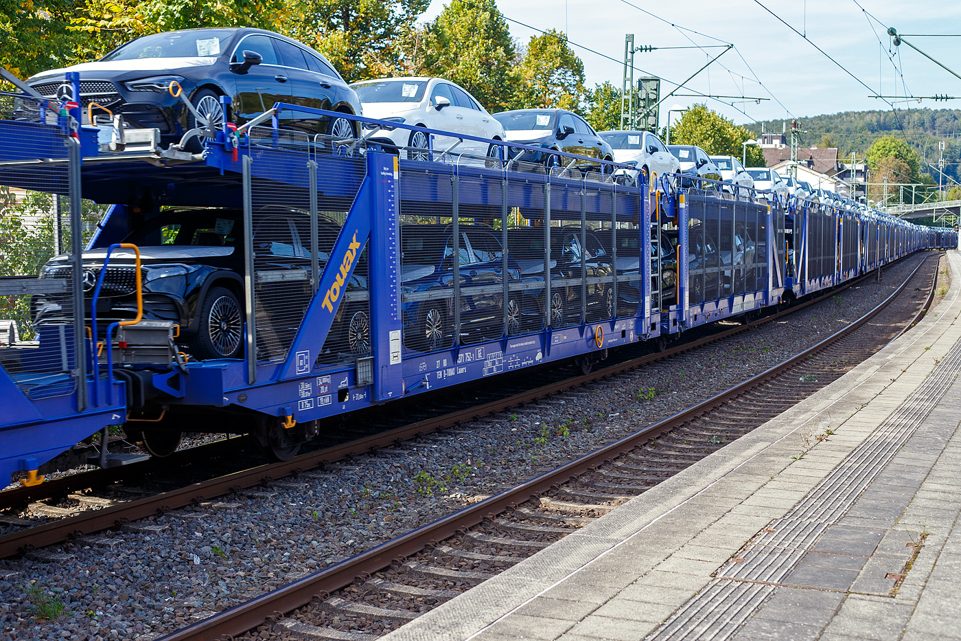 Vierachsige (2 x 2 achsiger) offener Doppelstock-Autotransportwagen (Wageneinheit) beladen PKW der Marke Mercedes-Benz, 27 80 4371 685-3 D-TOUAX, der Gattung Laaers, der irländischen Vermietungsfirma TOUAX Rail Limited, vermietet an die Hödlmayr International GmbH (Schwertberg/Österreich), am 22 September 2024 eingereiht im Zugverband bei einer Zugdurchfahrt im Bahnhof Kirchen (Sieg).
