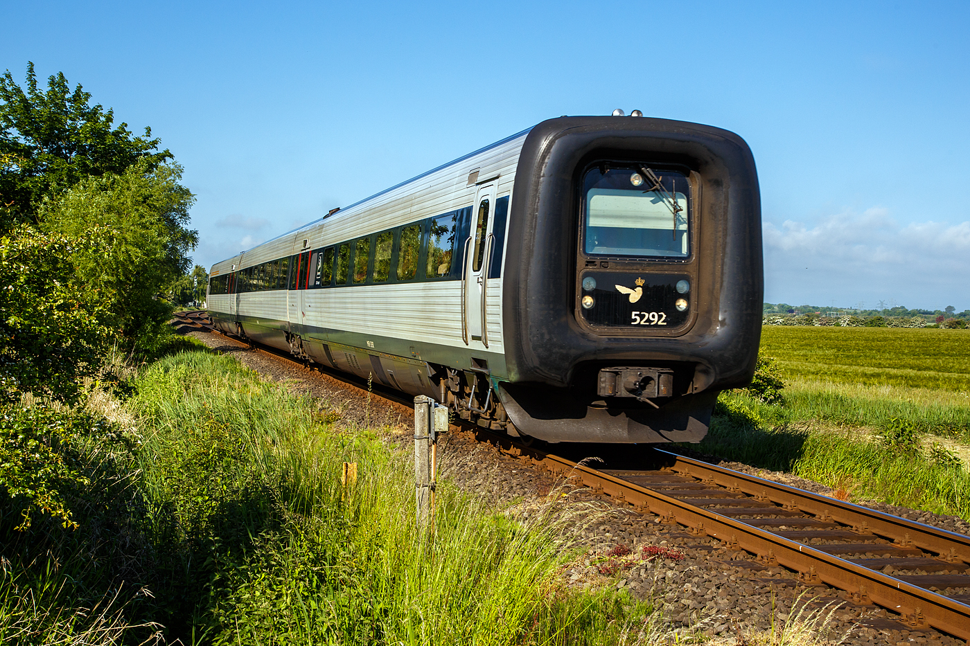 Die Vogelfluglinie (dänisch: Fugleflugtslinjen) ist nicht elektrifiziert und somit fahren hier Dieseltriebzüge vom Typ DSB IC 3 (DSB Gumminasen). Zwischen Ende 2007 und Oktober 2017 beteiligte sich die Deutsche Bahn mit den wieder reaktivierten ICE-TD (BR 605) erneut am EuroCity-Reiseverkehr auf der Vogelfluglinie.