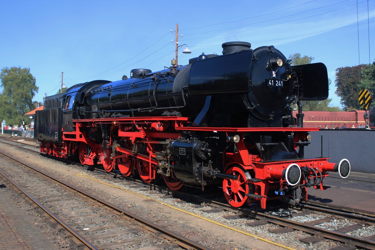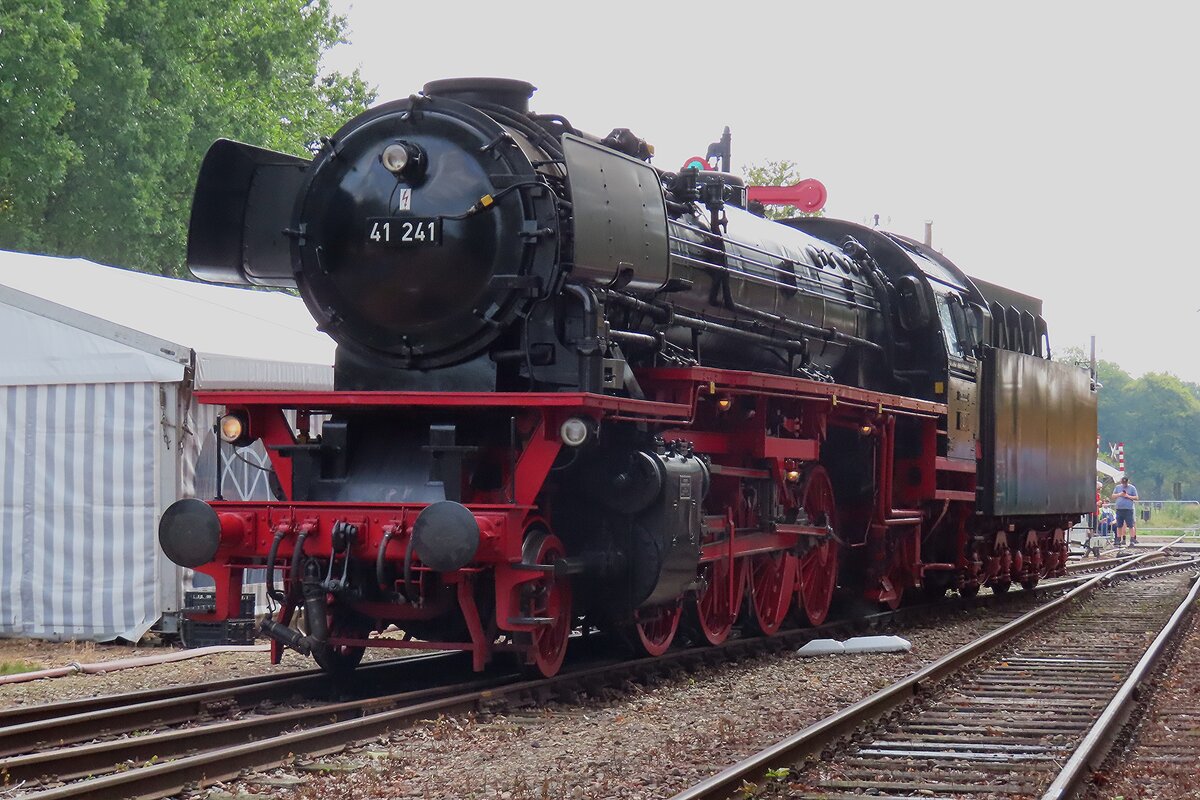 Gerade rechtzeitig betriebsfähig ist 41 241 der VSM geworden und am sonnigen 3.September 2023 strahlt sie im vollen Pracht beim Einfahrt in Loenen mit ein Fotoguterzug während terug naar Toen, dass grösste Dampflokfestival der Niederlande. Leon Schrijvers