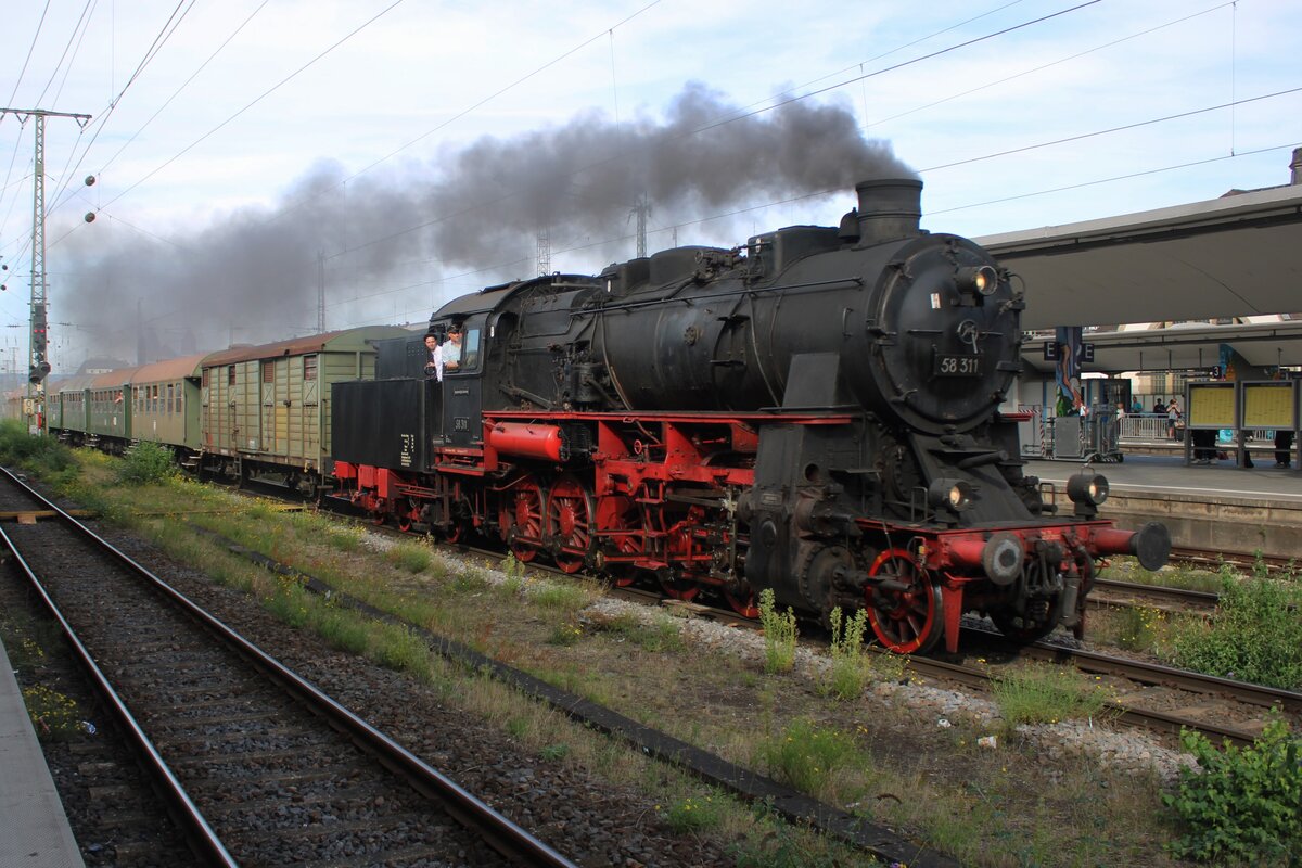 Durch den mächtigen Rauch kann man die Dreizylinder-Güterzug-Dampflokomotive 58 311 der UEF Ulmer Eisenbahnfreunde (ex DR 58 1111-2, ex DR 58 311, ex G 12 Baden 1125), nur nach erahnen. Sie war mit dem Sonderzug der Eisenbahnfreunde Treysa e.V. von der Bindweide auf der Rückfahrt und musste im Bahnhof Herdorf am 26.01.2019 einen Gegenzug abwarten, nun hat sie Hp 2 (Fahrt) und es geht weiter.