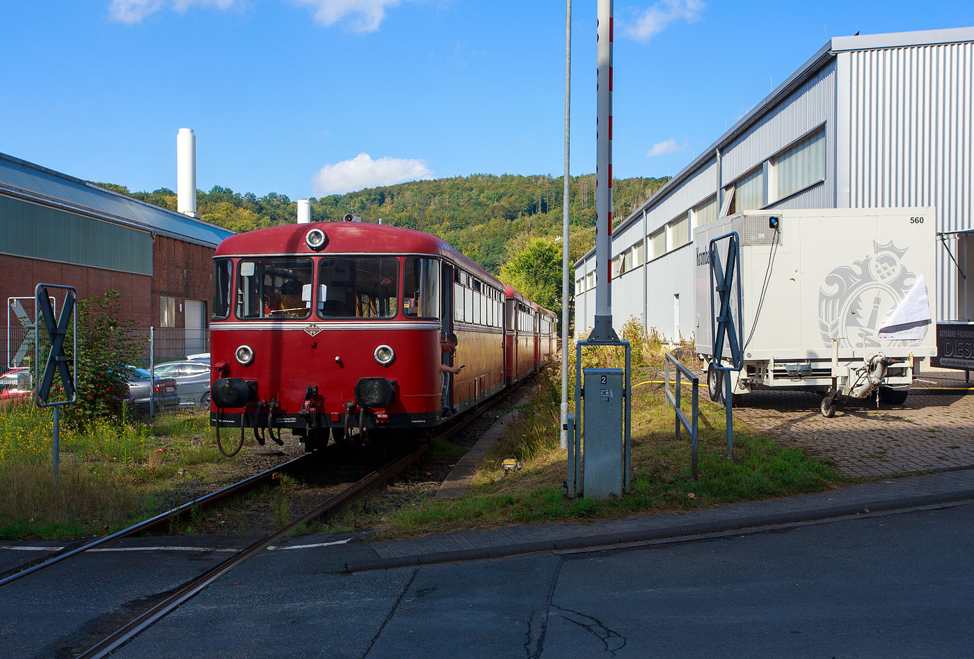 An diesem Wochenende war bundesweit an vielen Orten im Rahmen der "Europäische Mobilitätswoche" der „Tag der Schiene 2023“ so auch in Siegen beim KSW Bahnhof Siegen-Eintracht war am 17.09.2023 Tag der offenen Tür, dazu reisten auch die Oberhessische Eisenbahnfreunde e. V. mit einer Schienenbus-Garnitur aus Gießen an und tätigten zudem zwei Pendelfahrten von Siegen nach Betzdorf (Sieg) und zurück. Hier erreicht die vierteilige Schienenbus-Garnitur der Oberhessische Eisenbahnfreunde e. V. Gießen den KSW Bahnhof Siegen-Eintracht, nach der ersten Pendelfahrt. Die Komposition bestand aus dem: • Ehemaligen Betzdorfer Schienenbus Steuerwagen VS 996 677-1 (95 80 0 996 677-0 D-OEF), ex DB 998 677-9, ex DB VS 98 077. Gebaut 1959 von der Waggonfabrik Uerdingen AG in Krefeld-Uerdingen unter der Fabriknummer 66518. • Schienenbus Triebwagen VT 798 589-8 (95 80 0 798 589-7 D-OEF), ex DB VT 98 9589. Gebaut 1956 von der Waggon- und Maschinenbau GmbH in Donauwörth (WMD) unter der Fabriknummer 1225. • Schienenbus Beiwagen VB 996 310-9 (95 80 0996 310-8 D-OEF), ex DB 998 310-7, ex VB 98 2310. Gebaut 1962 von der Waggonfabrik J. Rathgeber AG in München unter der Fabriknummer 20302/25. • Schienenbus Triebwagen VT 798 829-8 (95 80 0798 829-7 D-OEF), ex DB VT 98 9829. Gebaut 1962 von der Maschinenfabrik Augsburg-Nürnberg AG (MAN) unter der Fabriknummer 146611. So waren in dieser Schienenbus-Garnitur auch alle vier Hersteller vertreten.