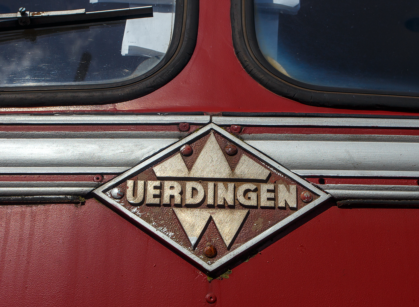 Ueurdinger Firmenlogo /-schild auf der Front von dem Schienenbus Steuerwagen VS 996 677-1 am KSW Bahnhof Siegen-Eintracht (17.09.2023).