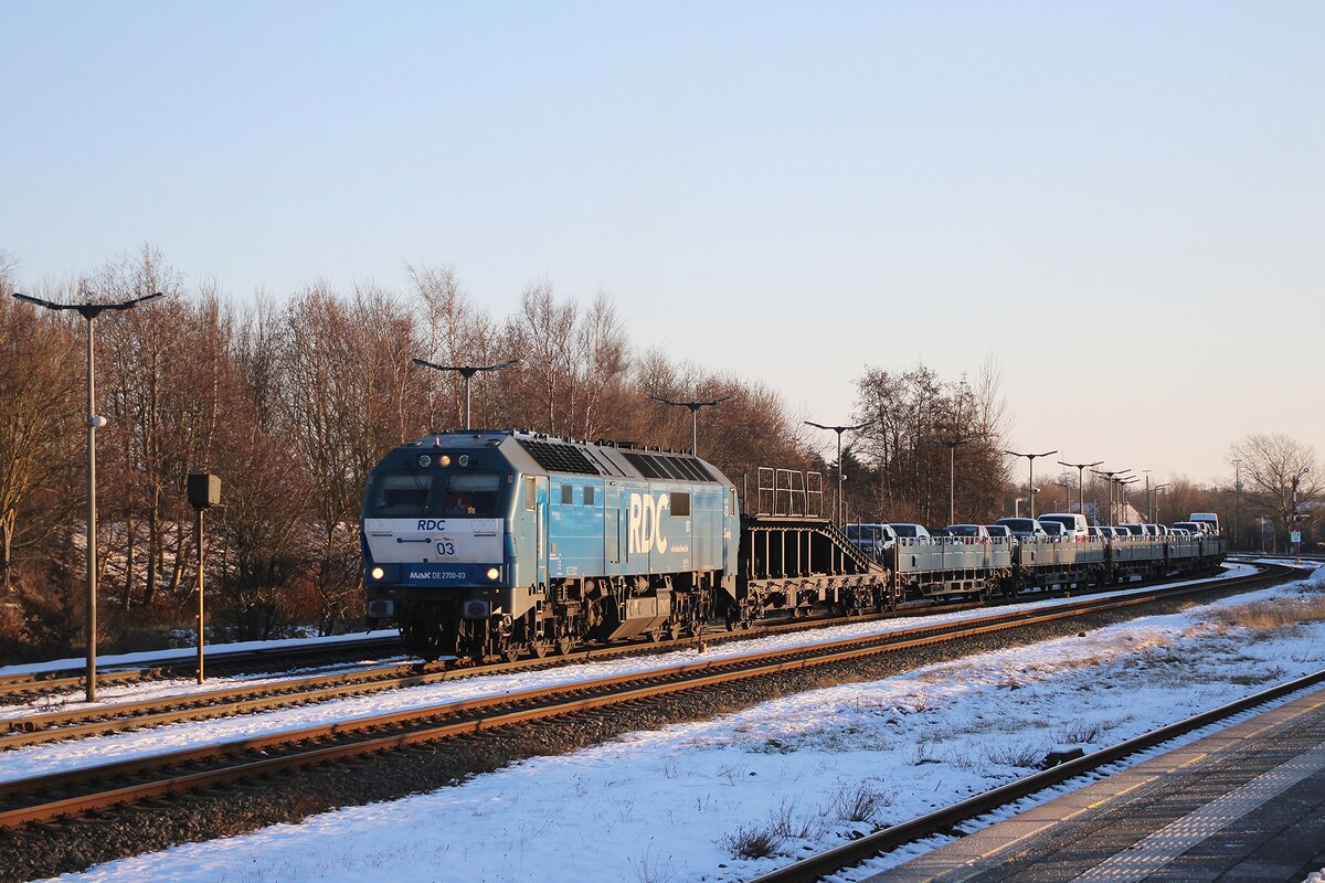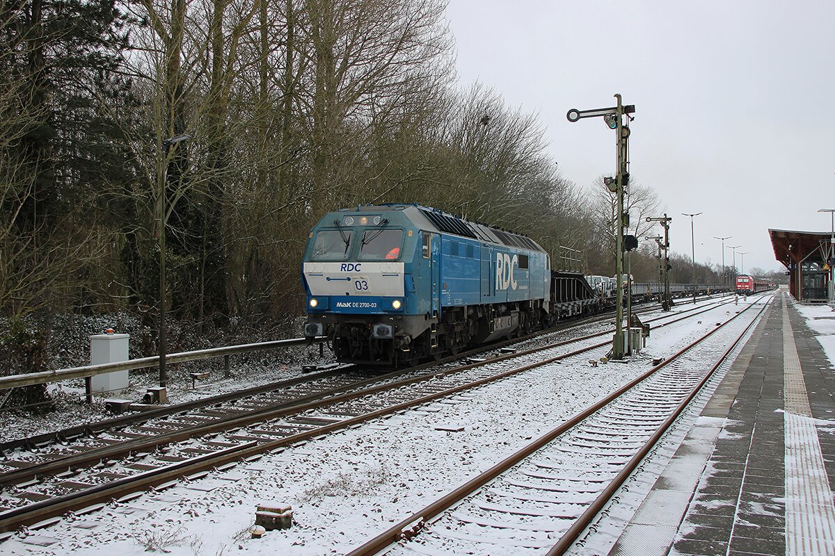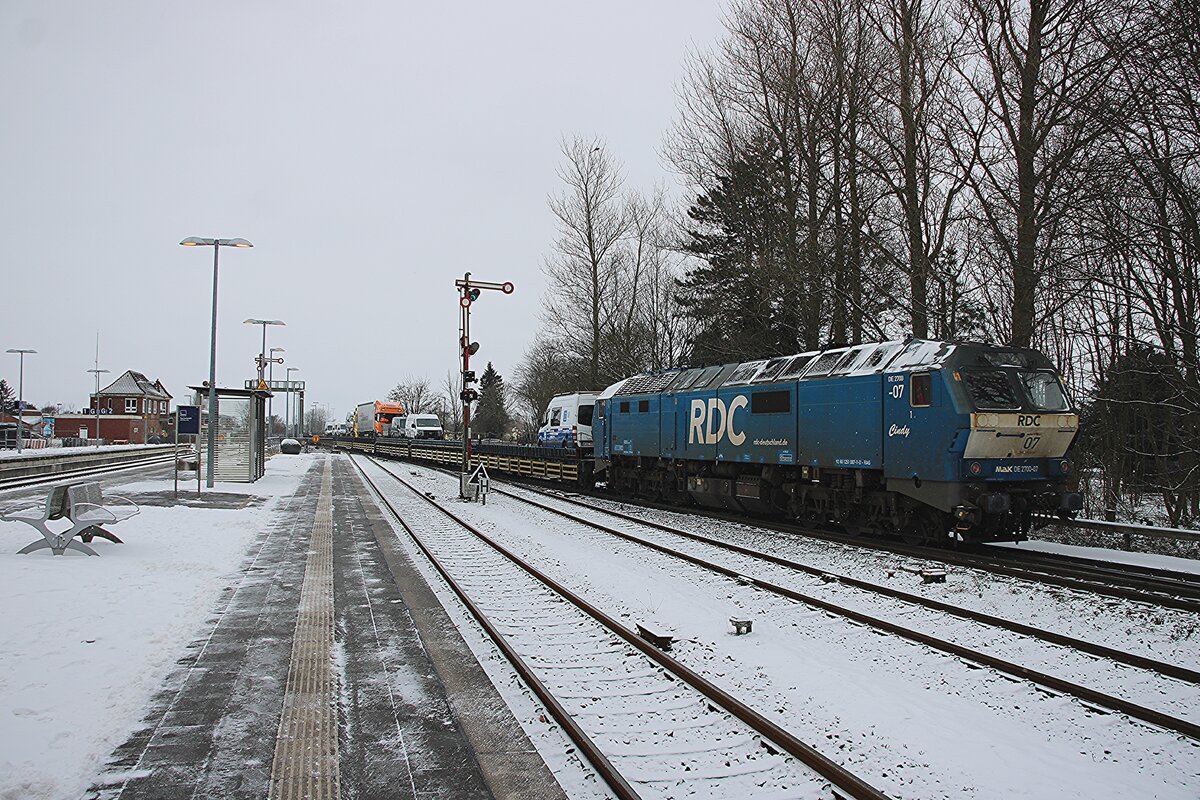 RDC DE 2700-07 schiebt, schmüztig und stark, ein RDC Autozug aus Niebüll nach Westerland (Sylt) am 16 Februar 2026. Schiebediensten an Syltshuttles und RDC Autozüge sind jedoch etwas rares...