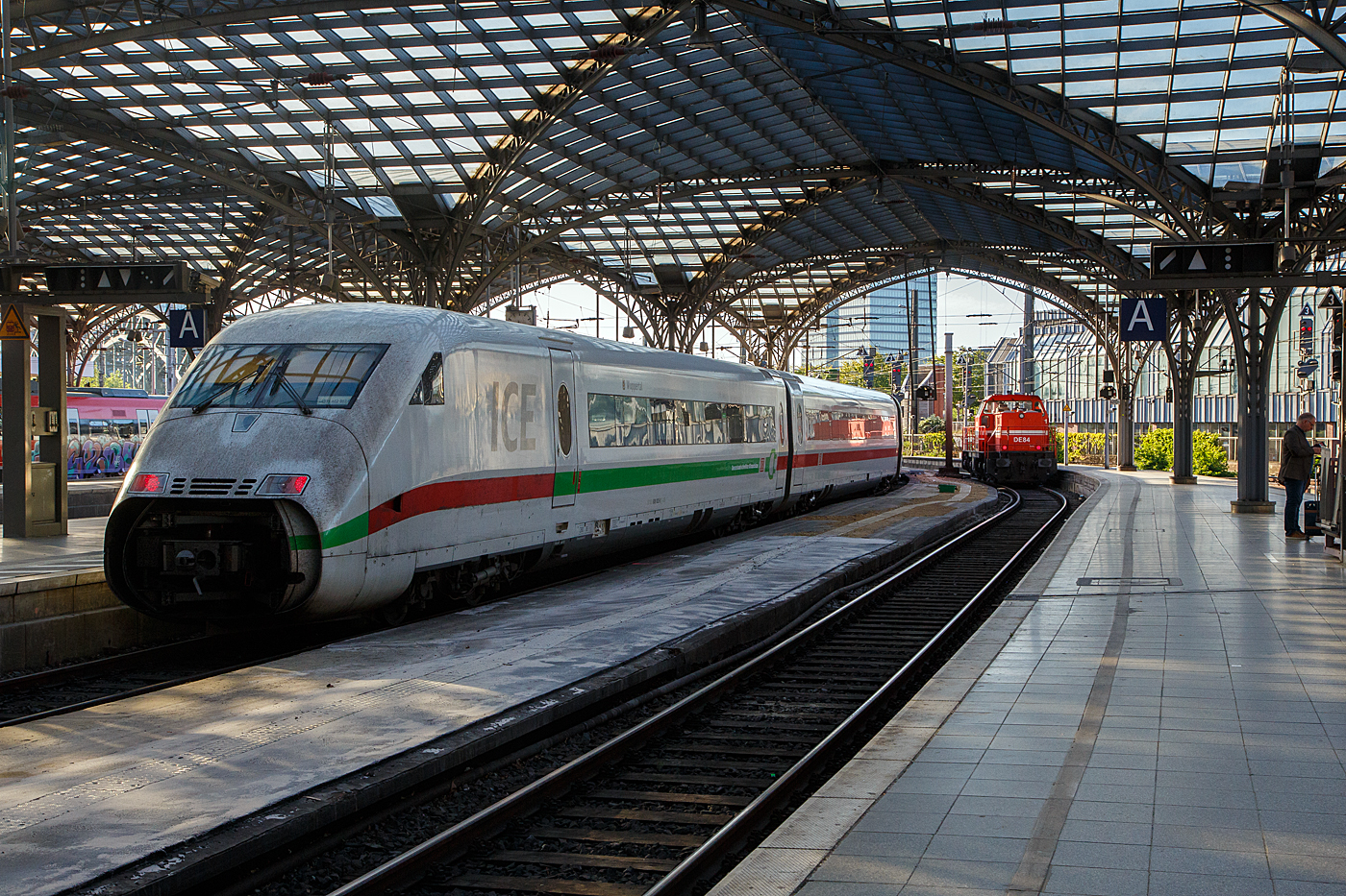 Die RheinCargo DE 93 alias 272 011-4 (98 80 0272 011-4 D-RHC), eine MaK DE 1002 der RheinCargo fährt am Sonntag den 30.04.2023 als Lz (Lokzug) bzw. auf Tfzf (Triebfahrzeugfahrt) durch den Bahnhof Köln-Ehrenfeld in Richtung Köln-Nippes.