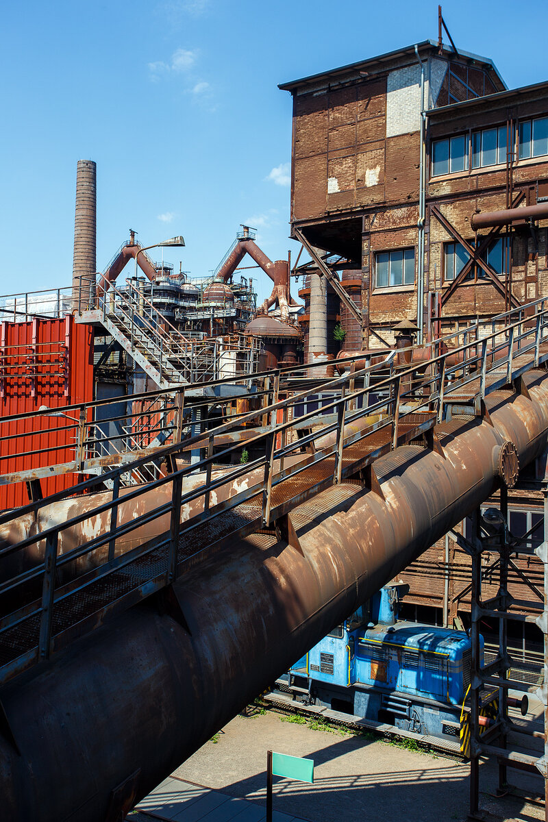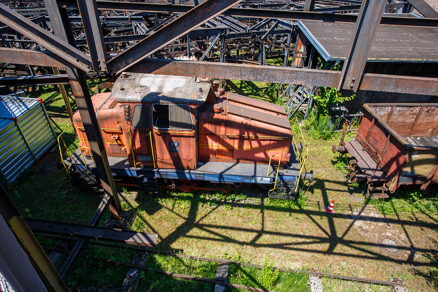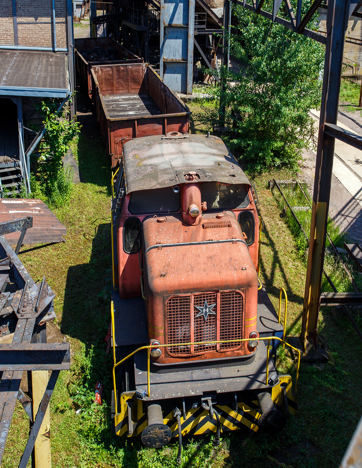 Die ex D V der AG der Dillinger Hüttenwerke (Normalspur – Diesellokomotive 5 /Henschel 29726), eine C-gekuppelte Henschel DH 440 Ca, hier am 01 Juli 2025 als Denkmal ausgestellt im Bereich der Kokssieberei der Völklinger Hütte.