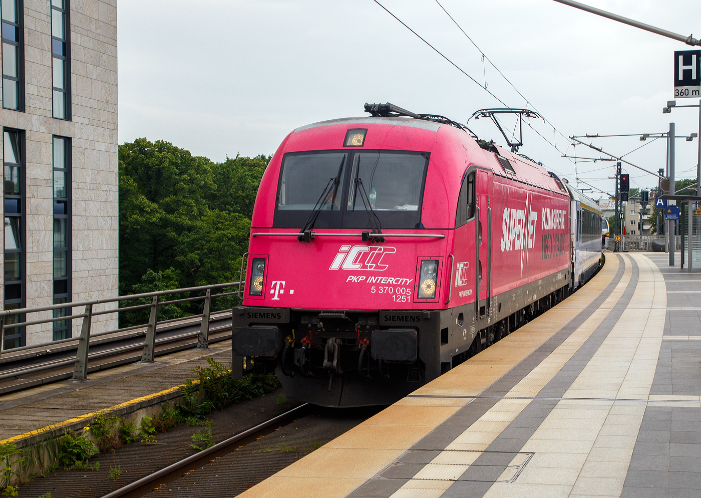 Die am die SBB Cargo International AG vermietete Re 482 011-4 „ChemOil“ (91 85 4482 011-4 CH-SBBC) der SBB Cargo AG fährt am 01 August 2025, mit einem KLV-Zug (HUPAC-Ganzzug) durch den Bahnhof Kirchen/Sieg in Richtung Köln.
