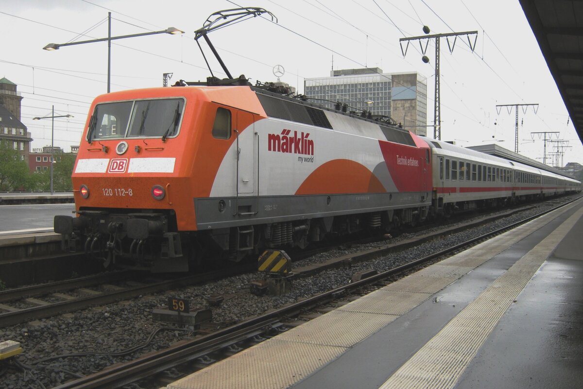 Am 11 mai 2012 steht 120 112 mit Märklin-Eerbung in Essen Hbf.