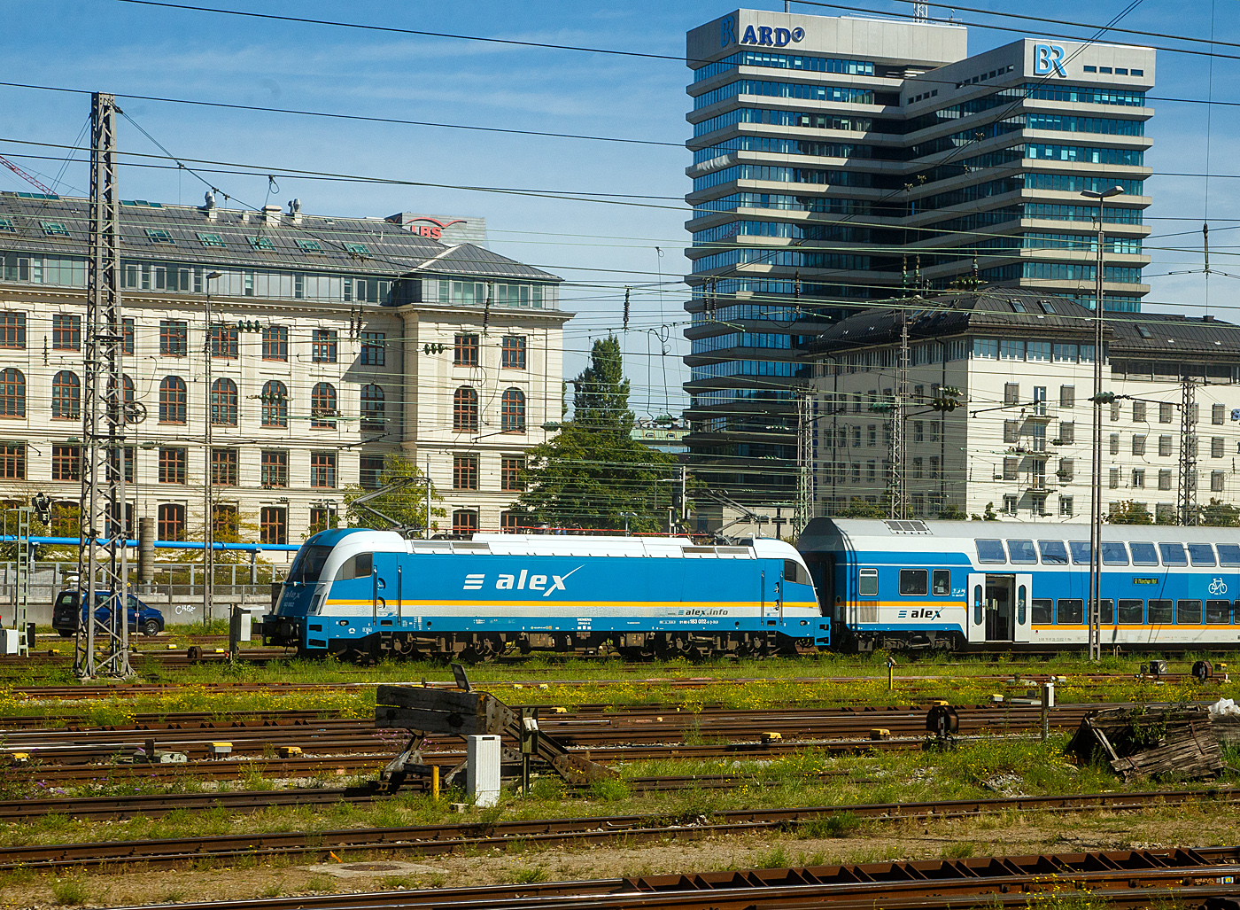 Die wunderschöne ALEX Lok 183 001-7 (91 80 6183 001-7 D-DLB) "175 Jahre Deutsche Eisenbahn" schiebt am 06 Juni 2019 einen ALEX-Zug aus den Hbf München in die Abstellgruppe. Das Design ist von der Österreicherin Gudrun Geiblinger und angelehnt an die Lokomotive "Adler"