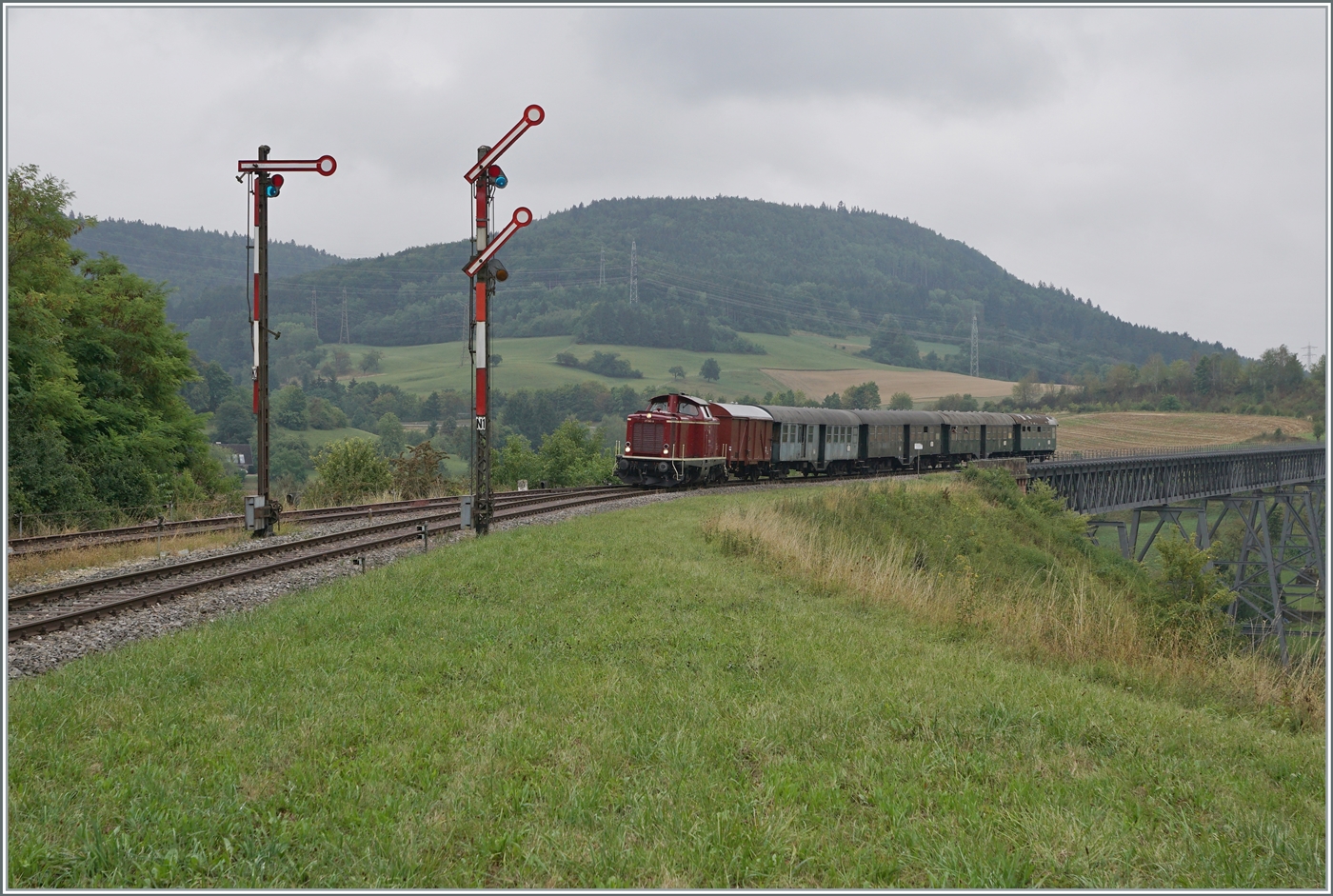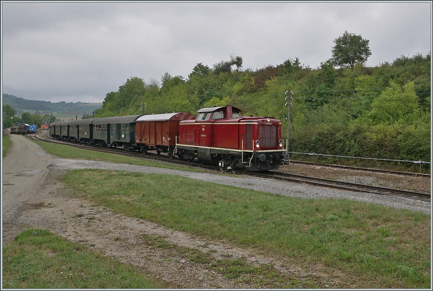 Die Arbeit wird einer Museumsbahn wohl nie ausgehen: die 236 119-4 steht mit zwei Wagen im Bahnhof von Epfenhofen.