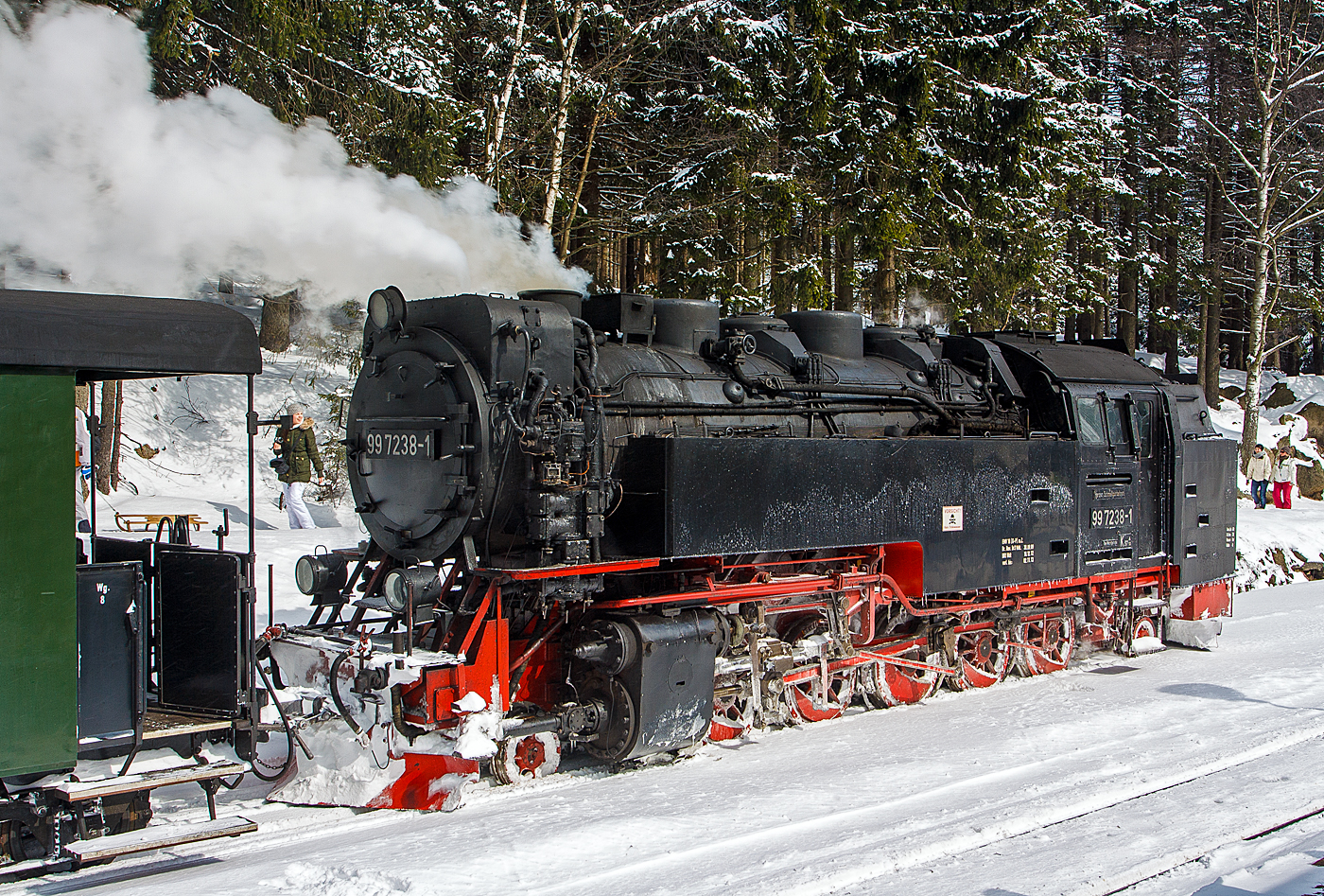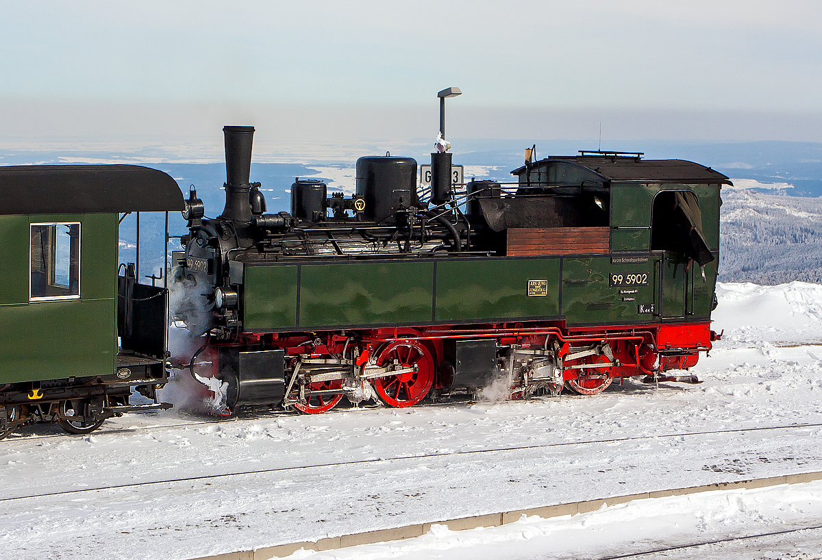Die Neubau-Dampfloks der HSB - Harzer Schmalspurbahnen 99 7241-5 (ex DR 099 151-3, 99 0241-2, 99 241) stehen am 23.03.2013 auf dem Bahnhof Brocken (1.125 m ü.NN) zu Talfahrt bereit.
