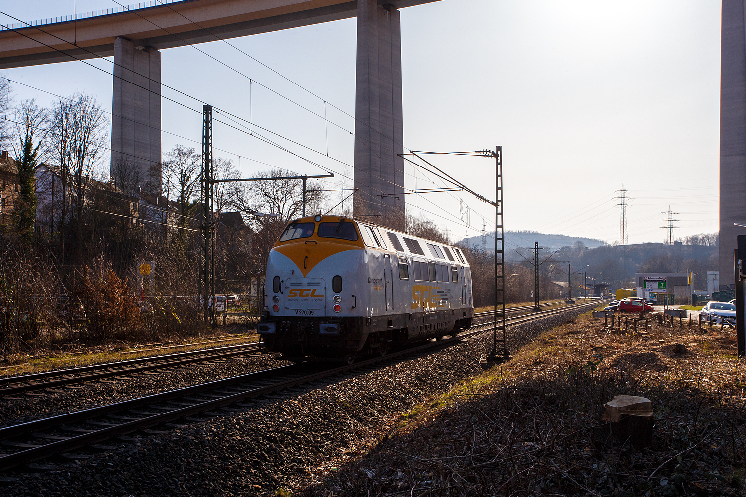 Die V 270.09 alias 221 121-7 (92 80 1221 121-7 D-SGL), eine V 200.1 der SGL Schienen Güter Logistik GmbH (Dachau), fährt am 05 März 2026 auf Tfzf (Triebfahrzeugfahrt) / als Lz (Lokzug) durch Siegen-Eiserfeld in Richtung Köln. Die SGL Schienen Güter Logistik GmbH ist seit Herbst 2023 Teil der tschechischen EP Logistik International a.s. in Prag. Die V 200.1 wurde 1964 von der Krauss-Maffei AG in München-Allach) unter der Fabriknummer 19241 gebaut und als V 200 121 an die Deutsche Bundesbahn geliefert. Bezeichnungen und Eigentümer waren: • 1964-1968: DB V 200 121 (Deutsche Bundesbahn) • 1968-1989: DB 221 121-7 (Deutsche Bundesbahn) • 1989-2002: ΟΣΕ A 427 (OSE- Organismós Sidirodrómon Elládos / griechische Eisenbahn) • 2002-2009: 221 121-7 (PE - Prignitzer Eisenbahn GmbH) • seit 2009: V 270.09 alias 221 121-7 (92 80 1221 121-7 D-SGL) der SGL - Schienen Güter Logistik GmbH, Dachau Ende 1988 erwarb die ΟΣΕ (Griechische Staatsbahn) 20 Lokomotiven der Baureihe V 200.1 von der DB und ließ sie in Deutschland und Italien technisch und optisch aufarbeiten. 2002 wurde die Lok A 415 zusammen den anderen 19 Lokomotiven der Baureihe durch die PE - Prignitzer Eisenbahn GmbH von der ΟΣΕ - Organismós Sidirodrómon Elládos übernommen und per Schiff zurück nach Deutschland transportiert. 2009 wurde die Lok an die SGL - Schienen Güter Logistik GmbH abgegeben und erhielt zum 29.September 2009 eine Untersuchung mit Neulackierung in den Farben hellgrau-schwarz. Zudem bekam die Lok neue MTU-Motoren. Nach der Untersuchung im Spätsommer 2018 zeigte sich die Lok in einer weiß-gelben Lackierung. Eingebaute Motoren: Von 1964 bis 2009: 2 Stück Maybach Mercedes-Benz Dieselmotor vom Typ OM 835 Ab (MB 835 Ab), ein V12-Zylinder-Viertakt- Dieselmotor mit Kolbenkühlung, mit einem Hubraum von 78.254 cm³ bzw. 78,25 Liter (Bohrung 190 mm x 230 mm Hub) und einer Leistung von je 1.350 PS. seit 2009: 2 Stück MTU - Motoren- und Turbinenunion (Friedrichshafen), Typ 12V 4000 R41, ein wassergekühlten V12-Zylinder-Dieselmotor mit Abgasturbolader und Ladeluftkühlung, mit einem Hubraum von 57.199 cm³ bzw. 57,2 Liter (Bohrung 170 mm x 210 mm Hub) und einer Leistung von je 2.000 PS. Bei der DB-Baureihe V 200.1 handelt es sich um eine Diesellokomotive der Deutschen Bundesbahn. Von 1962 bis 1965 wurden insgesamt 50 Lokomotiven beschafft, ab 1968 wird sie als Baureihe 221 geführt. Die Baureihe V 200.1 ist eine Weiterentwicklung der Baureihe V 200.0. Von der Baureihe V 200.0 unterscheidet sich die V 200.1 im Wesentlichen durch die stärkeren Antriebsmotoren von 2 × 1.350 PS gegenüber 2 × 1.100 PS. Die Höchstgeschwindigkeit beträgt 140 km/h. Diese wurden notwendig, da durch das gestiegene Verkehrsaufkommen die Züge länger und schwerer geworden waren. Dadurch kamen die Lokomotiven der Baureihe V 200.0 an ihre Leistungsgrenzen, was nicht selten zu Verspätungen führte. Das höhere Gewicht der neuen Motoren wurde zum Teil durch den Einsatz von Leichtbaustoffen und die Verwendung eines leichteren Kessels für die Dampfheizung wieder ausgeglichen. Die Leichtbauweise führte zu Beginn der 1980er Jahre zu zunehmenden Korrosionsschäden. Der hohe Unterhaltungsaufwand der zweimotorigen Lokomotiven und der rückläufige Güterverkehr im Ruhrgebiet führte bis Ende Mai 1988 zur Ausmusterung der Maschinen.