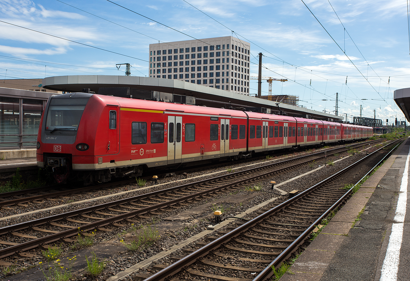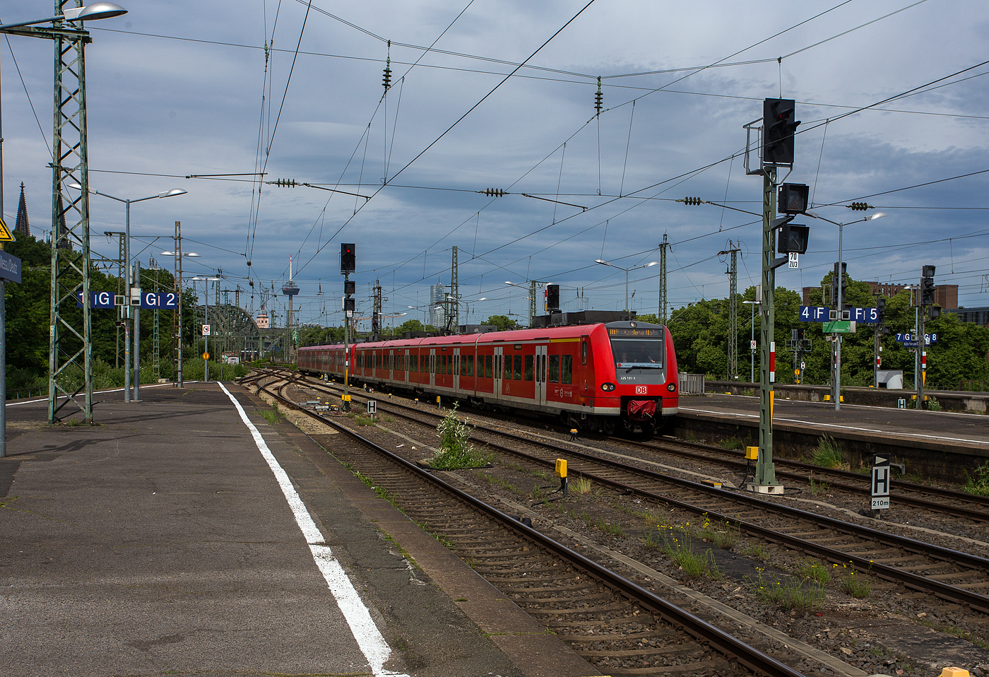 Zwei gekuppelte ET 425er (425 101-3 / 425 601 und 425 594 / 425 094-0)der DB Regio NRW erreichen am 26 Mai 2024, als RB 27 "Rhein-Erft-Bahn“ (Mönchengladbach – Köln – Koblenz), den Bahnhof Köln Messe/Deutz.