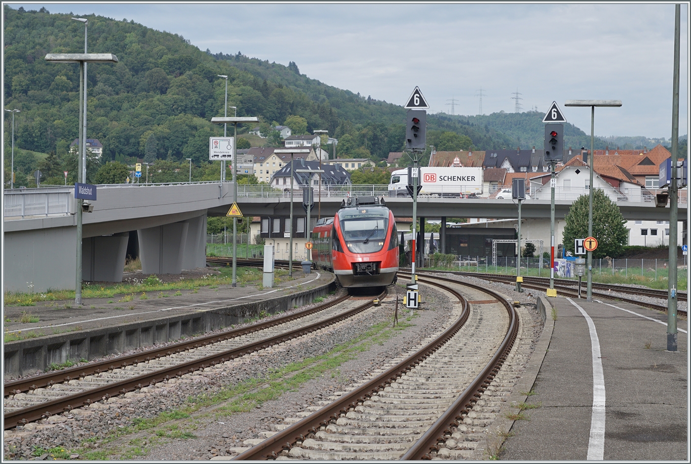 Recht fahren zwei gekuppelte 3-teilige diesel-elektrischen Bombardier Talent der Baureihe 644 der DB Regio NRW, als RB 64 „Euregio-Bahn“ Münster – Gronau – Enschede (NL), ein. Weiter rechts stehen noch weitere Bombardier Talent. Armin Schwarz