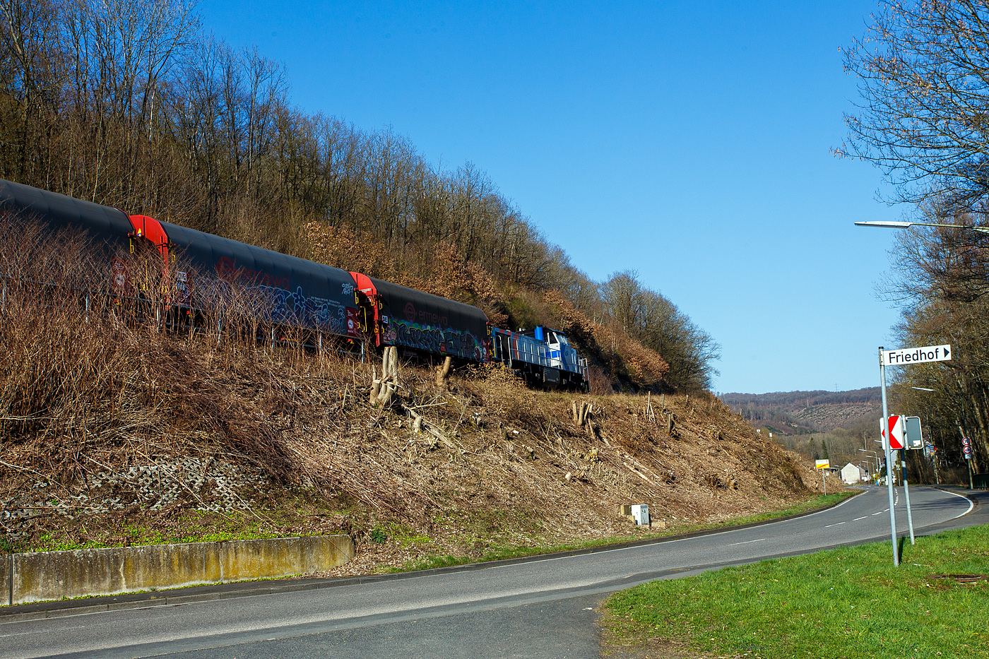 Die KSW 44 (92 80 1271 004-4 D-KSW) eine MaK G 1000 BB der KSW (Kreisbahn Siegen-Wittgenstein) am 03 Februar 2026 auf dem KSW-Rangierbahnhof in Herdorf, Betriebsstätte FGE -Freien Grunder Eisenbahn.
