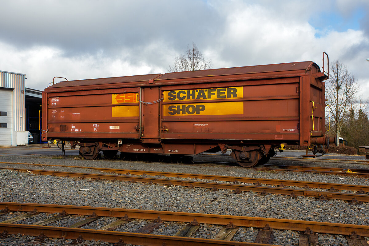 Der private gedeckte zweiachsige Güterwagen mit Schiebewänden und Schiebedach WEBA 07 - 10 80 0715 001-5 D-WEBA (ex 10 80 071 5 001-5 D-DB) der Gattung Tbis 869 - Bauform A (für Büromöbel der SSI Schaefer Shop GmbH) der Westerwald WEBA abgestellt am 07 Februar 2026 auf dem Betriebshof der Westerwaldbahn (WEBA) auf der Bindweide bei Steinebach/Sieg. Der Wagen ist auf DB-Strecke Scheuerfeld – Betzdorf/Sieg zugelassen.