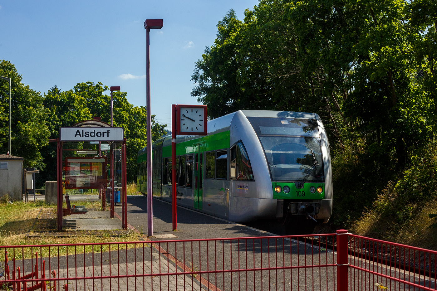 Der Stadler GTW 2/6 WEBA 109 (95 80 0946 409-9 D-WEBA / 95 80 0646 409-2 D-WEBA / 95 80 0946 909-8 D-WEBA) der Westerwaldbahn des Kreises Altenkirchen GmbH (WEBA), ex HLB VT 509 109, erreicht als RB 97  Daadetalbahn  von Daaden nach Betzdorf am 03 Juli 2025 den Hp Alsdorf.