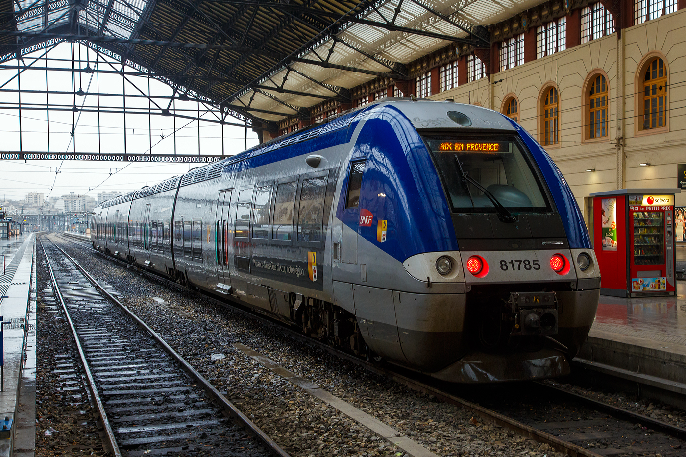 Die SNCF BB 22312 "Antibes / Juan-les-Pins" (BB 5 22312R bzw. UIC: F-SNCF 91 87 0022 312-) hat am 25 März.2015 mit einem TER Regionalzug den Bahnhof Marseille-Saint-Charles erreicht. Es regnete Bindfäden.