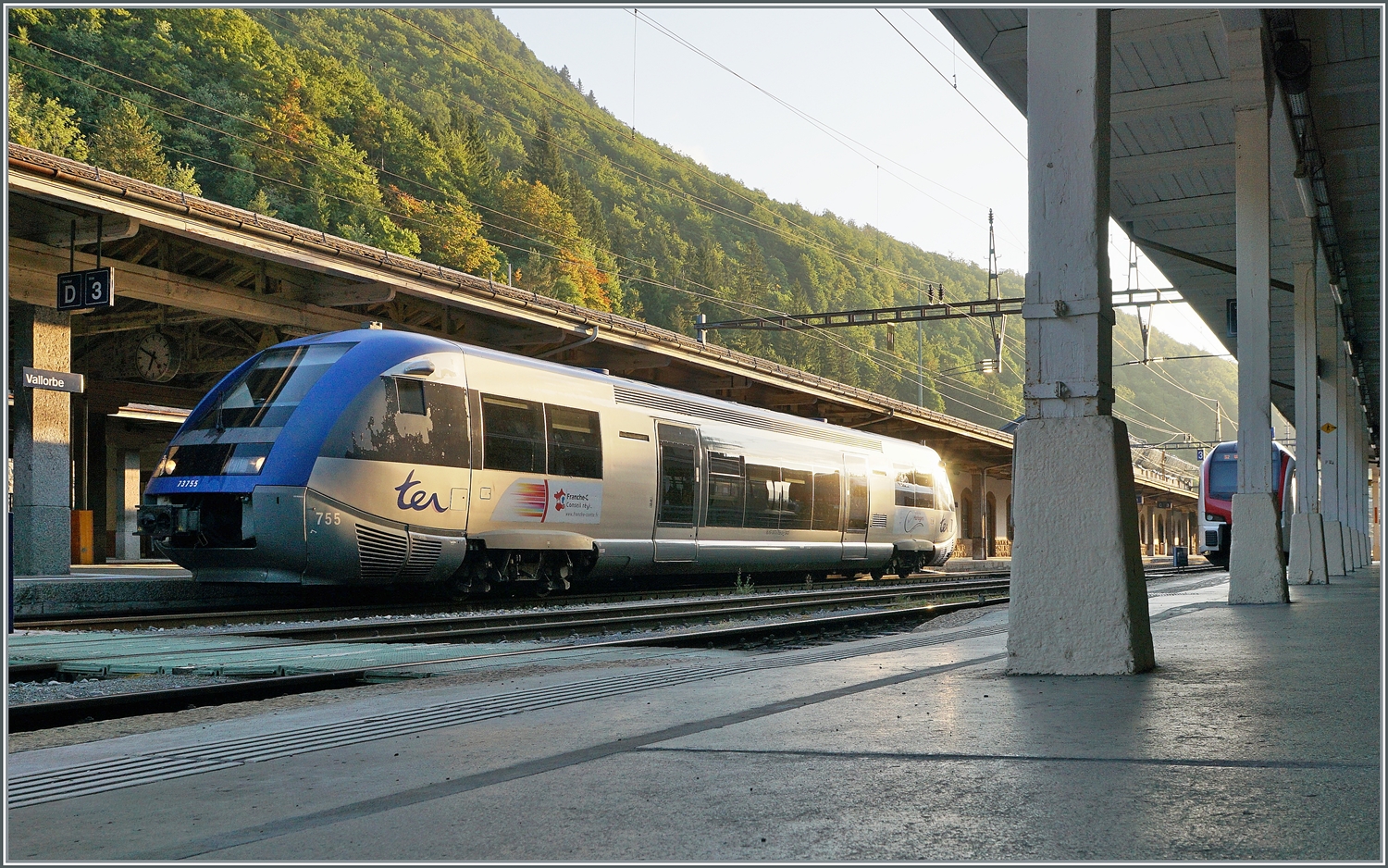 Eine weitere Variante der beiden Bahnhöfe Belfort-Montbéliard TGV (unten) und Meroux (oben). Der TGV LYRIA 9203 von Paris Gare de Lyon nach Zürich bestehend aus dem Triebzug 4726, bietet dem im Bahnhof von Meroux wartenden SNCF Z73800 Coradia A TER "Baleine" nach Belfort einen recht knappen Anschluss. Weshalb auf der elektrifizierten Strecke Delle - Belfort neuerdings (auch) Dieseltriebzüge zum Einsatz kommen entzieht sich meiner Kenntnis.