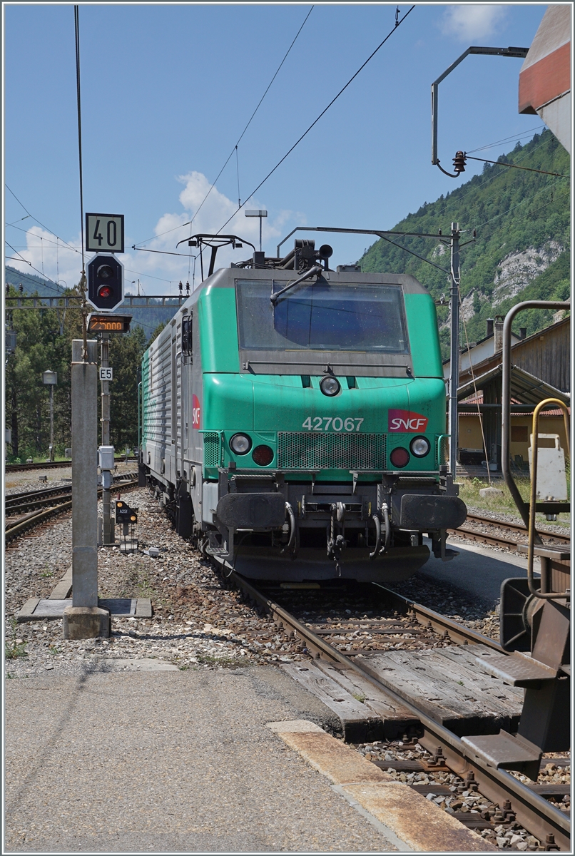 Die SNCF BB 27067 bzw. BB 427067 (UIC 91 87 0027 067-4 F-SNCF hat den Getreidezug nach Italien nachgeschoben und verlässt ihn nun in Vallorbe ohne fremde Hilfe, da die Rangierfahrstrasse auf die SNCF Fahrleitungsspannung umgeschaltet wurde. An der Spitze des Zugs wird in der Zwischenzeit die BB 26068 von der SBB Re 6/6 11688 manövriert und in den 50 Hz Bereich zurück gestossen. 16. Juni 2022