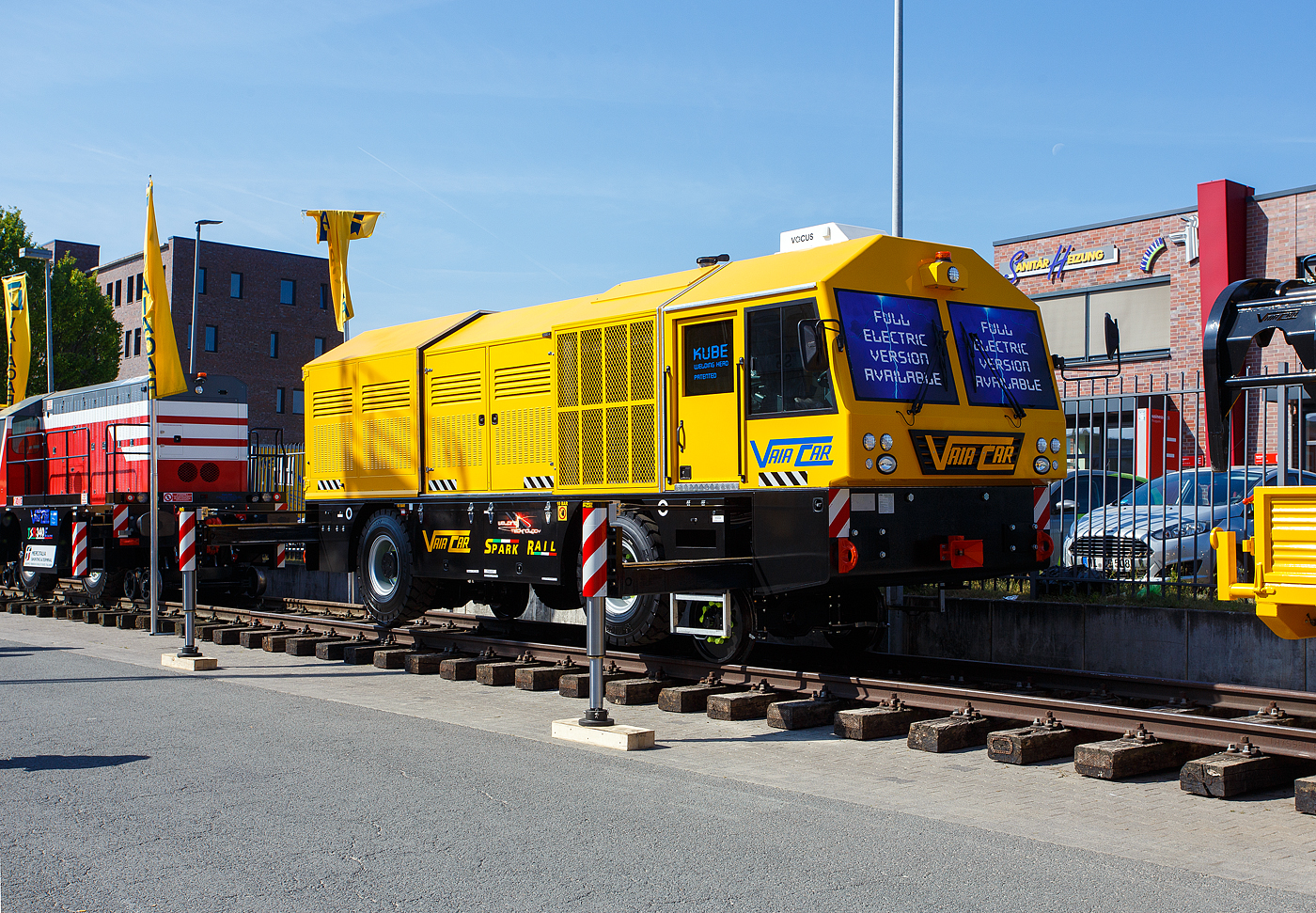 Die italienische VAIA CAR S.p.A. mit Sitz in Calvisano bei Brescia präsentierte auf der 29. Internationale Ausstellung Fahrwegtechnik 2025 (iaf) in Münster (hier am 20 Mai 2025) das Zweiwege-Schienenschweiß-Fahrzeug vom Typ Spark-Rail (als voll elektrischer Version), mit Schweißkopf vom Typ KUBE K355 (von VAIA CAR entworfen und patentiert). Das Fahrzeug ist mit vier hydraulischen Teleskopstabstützen ausgestattet, damit ist ein Anheben und seitliches Verschieben des Fahrzeugs für den Übergang von der Straße auf die Schiene und umgekehrt möglich. Zudem ermöglicht es das Anheben des Fahrzeugs für Wartungsarbeiten (z. B. Reifenwechsel). TECHNISCHE DATEN: Spurweite: 1.435 mm (Normalspur) Länge über Puffer: 8.550 mm Breite: 2.550 mm (ohne Rückspiegel) Höhe: 3.550 mm (auf Schiene) Straßenräder Bereifung: MICHELIN Type 12.00 R 20 XZM (Ø 1.176 mm) Schienenführung: absenkbare Spurkranzräder Ø 645 mm (neu) Achsabstand Straßenräder: 3.800 mm Achsabstand (Schienenräder): 4.950 mm Laufraddurchmesser Schienenräder: 645 mm (neu) Eigengewicht: ca. 31.000 kg Höchstgeschwindigkeit: 25 km/h (Straße) / 42 km/h (auf Schiene)