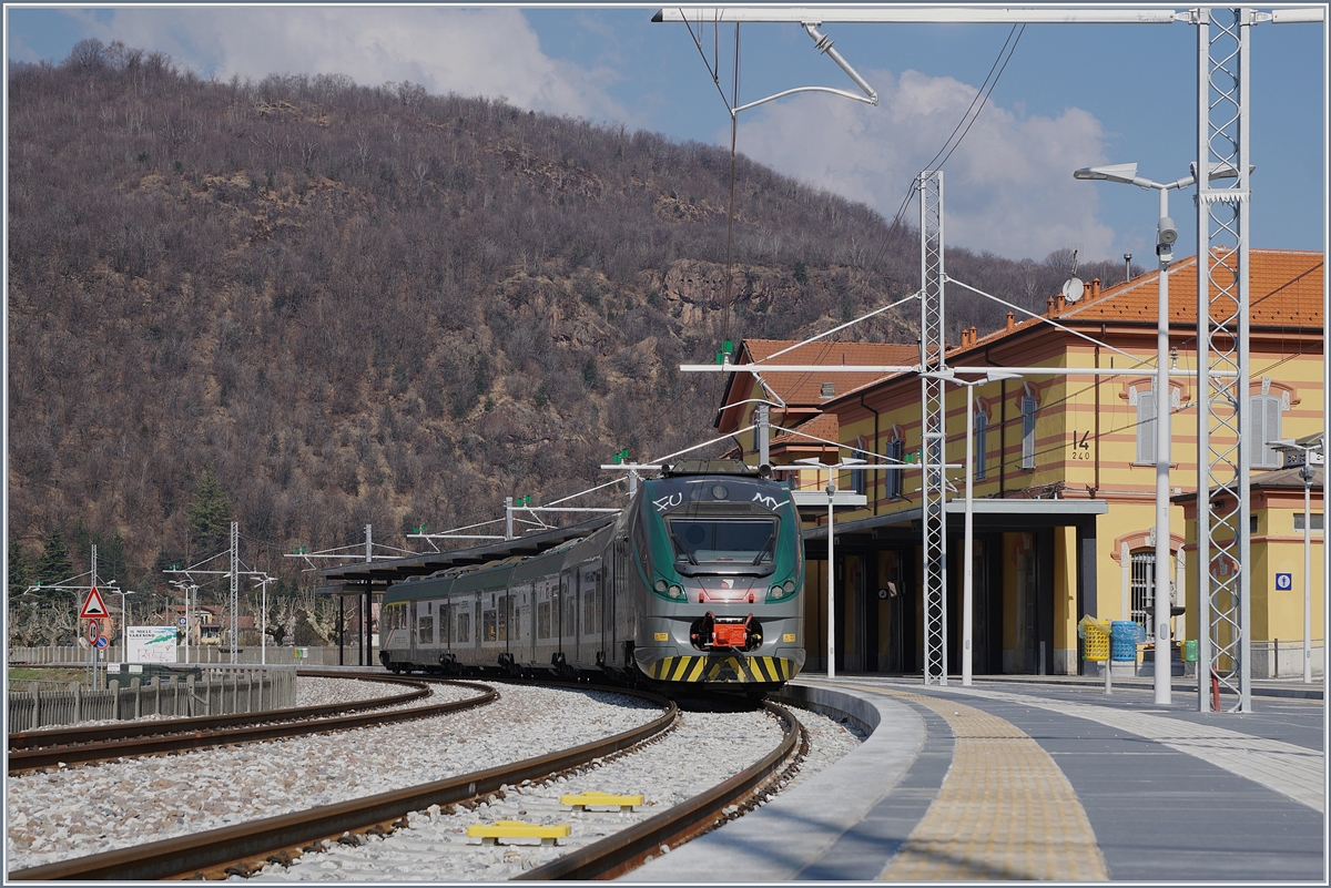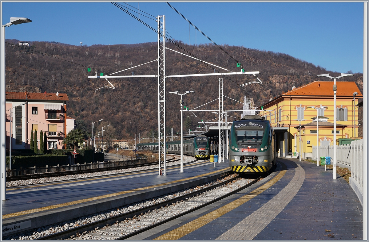 Trenord ETR 521 "Rock" haben die formschönen und komfortablen ETR 425 auf der RE Strecke Milano Porta Garibaldi - Porto Ceresio abgelöst. Sonnenstand, Länge und Position der ETR 521 030 der als RE 2528 von Milano Porta Garibaldi angekommen ist und RE 2537 wieder zurückfährt, erlauben kaum ein vernünftiges Bild.
