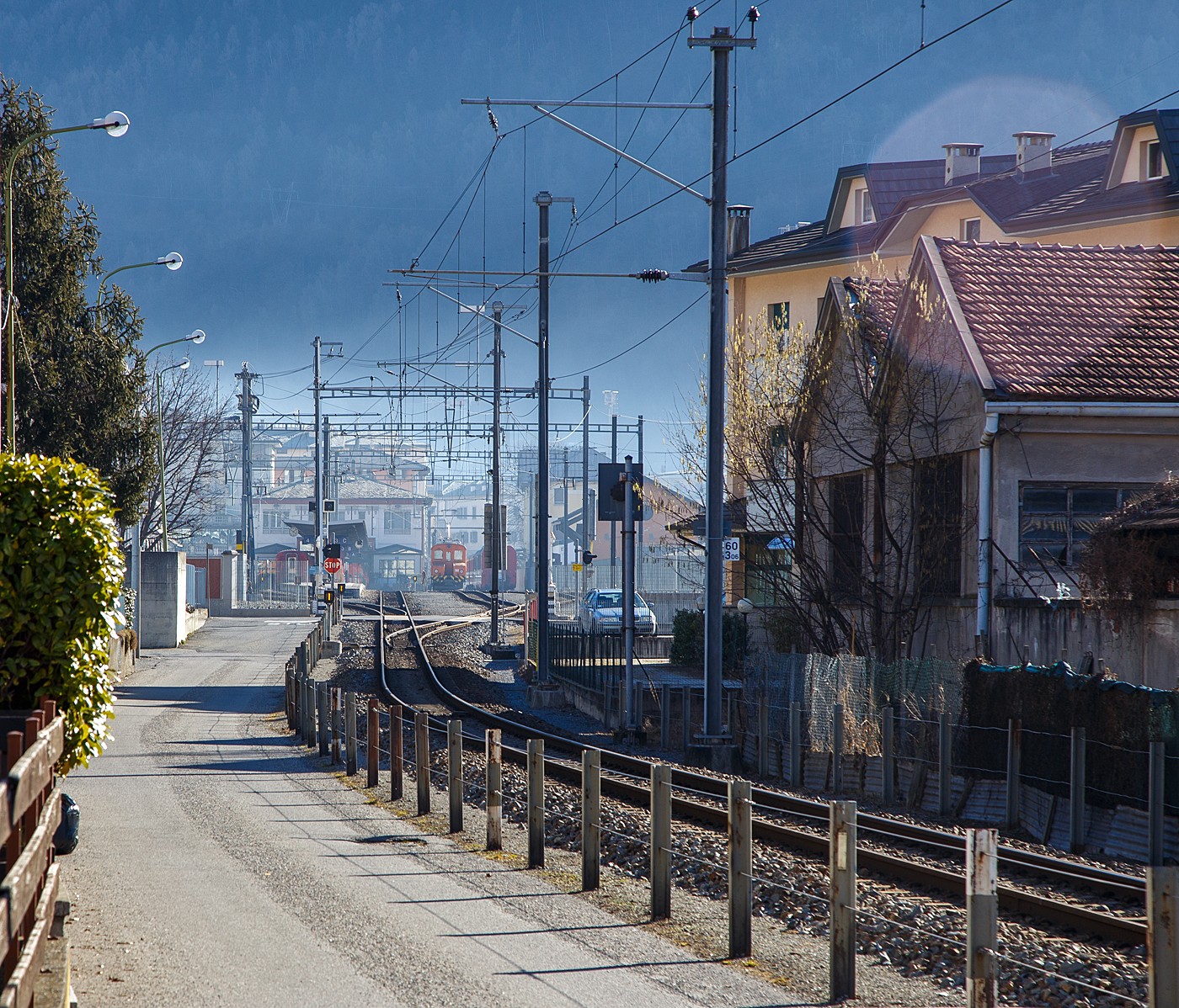 Der RhB-Bahnhof Tirano am Abend des 03.11.1019. Links der RhB Tm 2/2 22, ex RhB Tm 2/2 58.