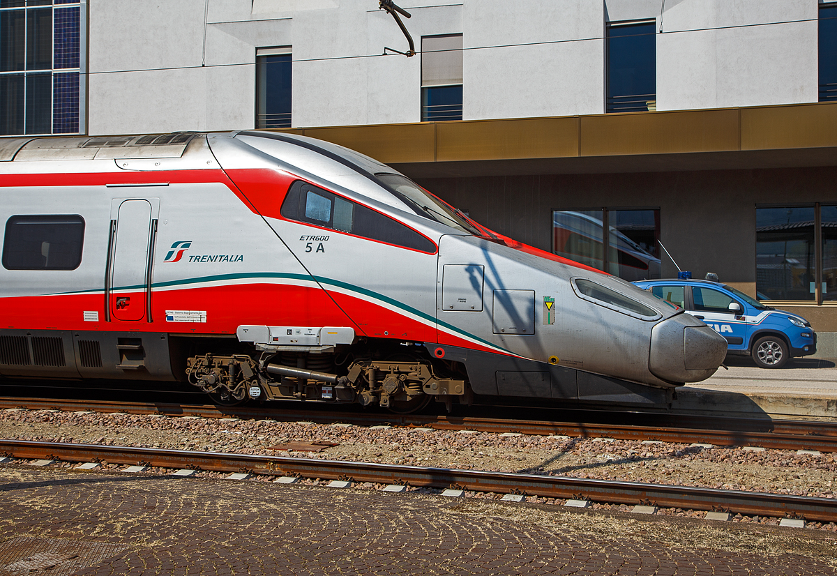 Der FS Trenitalia ETR 600 002 in neuer Frecciarossa Lackierung und ein weiterer ETR 600 sind als FR 8306 von Bari (ab 8:46) nach Roma Termini an (12:55) unterwegs und fahren mit recht hoher Geschwindigkeit durch den Bahnhof von Trani; so schnell, dass ich erst glaubte, einen ETR 400 aufgenommen zu haben und mich dann über die Formveränderte Lackierung wunderte. Erst nach genaueren Recherchen entdeckte ich, das zumindest am Samstag diese Leistung von ETR 600 absolviert wird (sonst sind meist ETR 485 im Einsatz)
