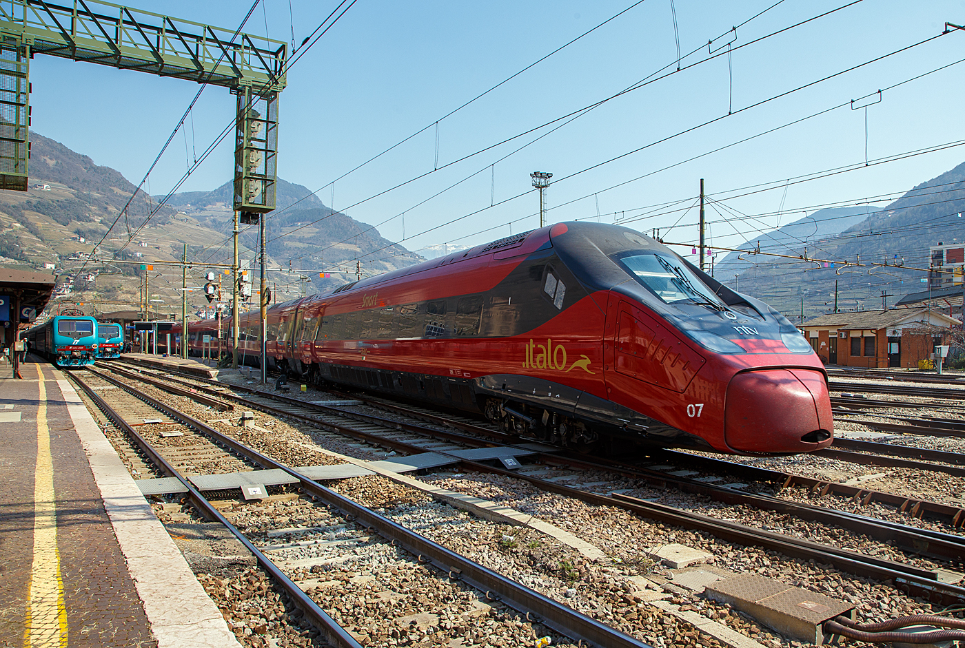 Während ein ETR BR 104 auf dem Zwischengleis Rangiert, fährt der ETR 675 22 Italo EVO, in den Bahnhof von Ferrara ein, oben rechts steht ein ETR BR 350 welcher auf seinen Einsatz wartet. 08.05.2025