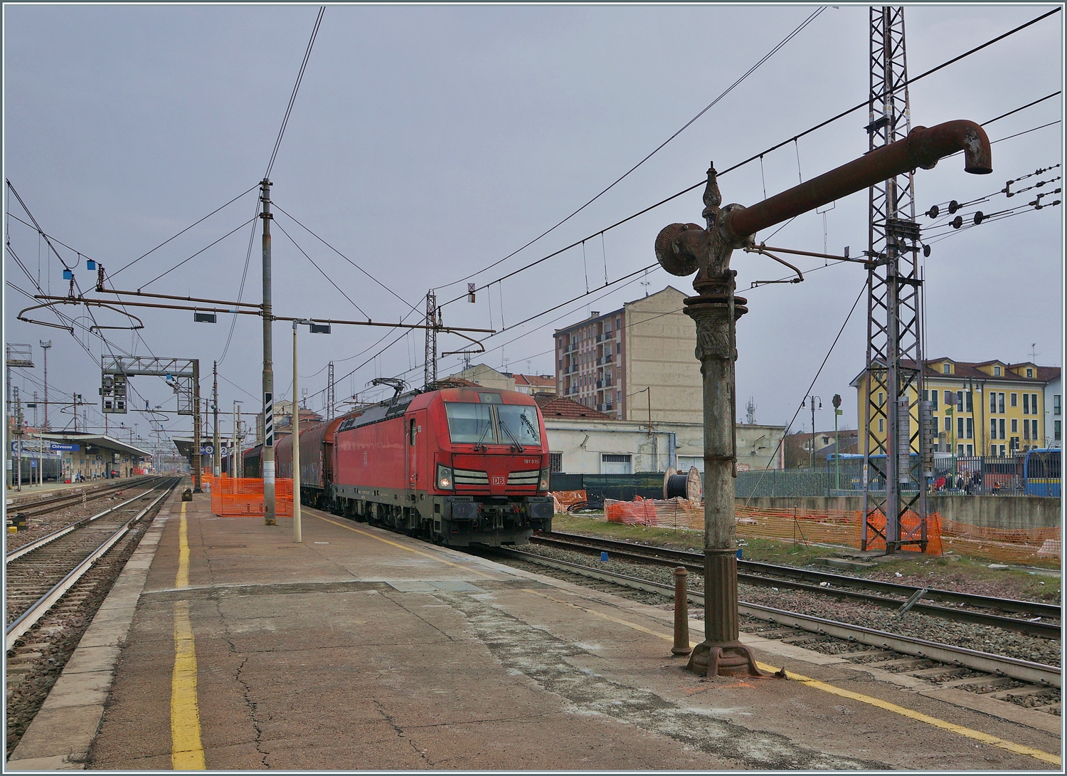 DB E Lok 191 018 durchfährt den Abstellbereich des Bahnhofs von Verona mit einem Tross Geschlossener Güterwagen der Gattung Tagnpps, die sie in der Güterzug Abstellung abgeholt hat. 09.05.2025