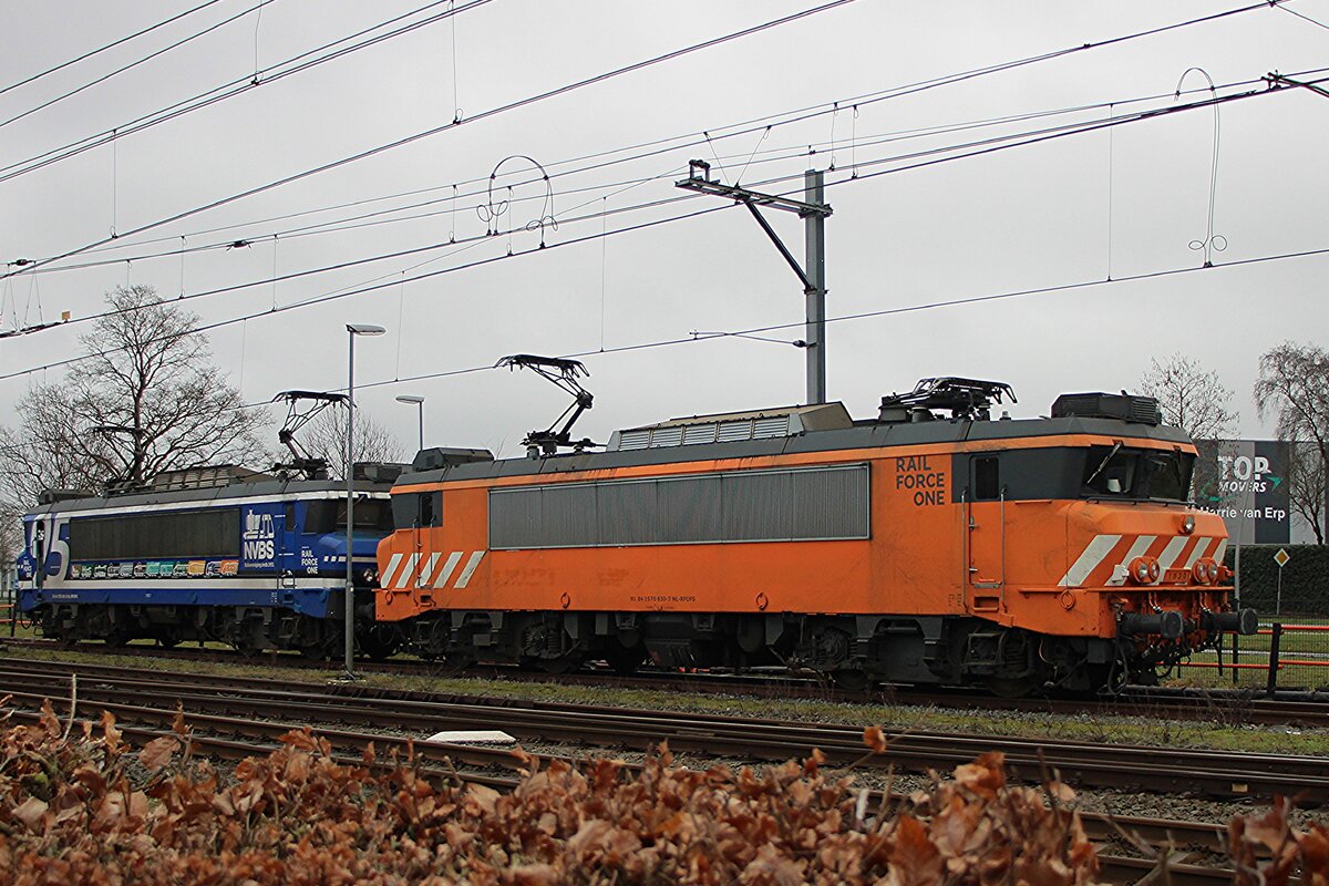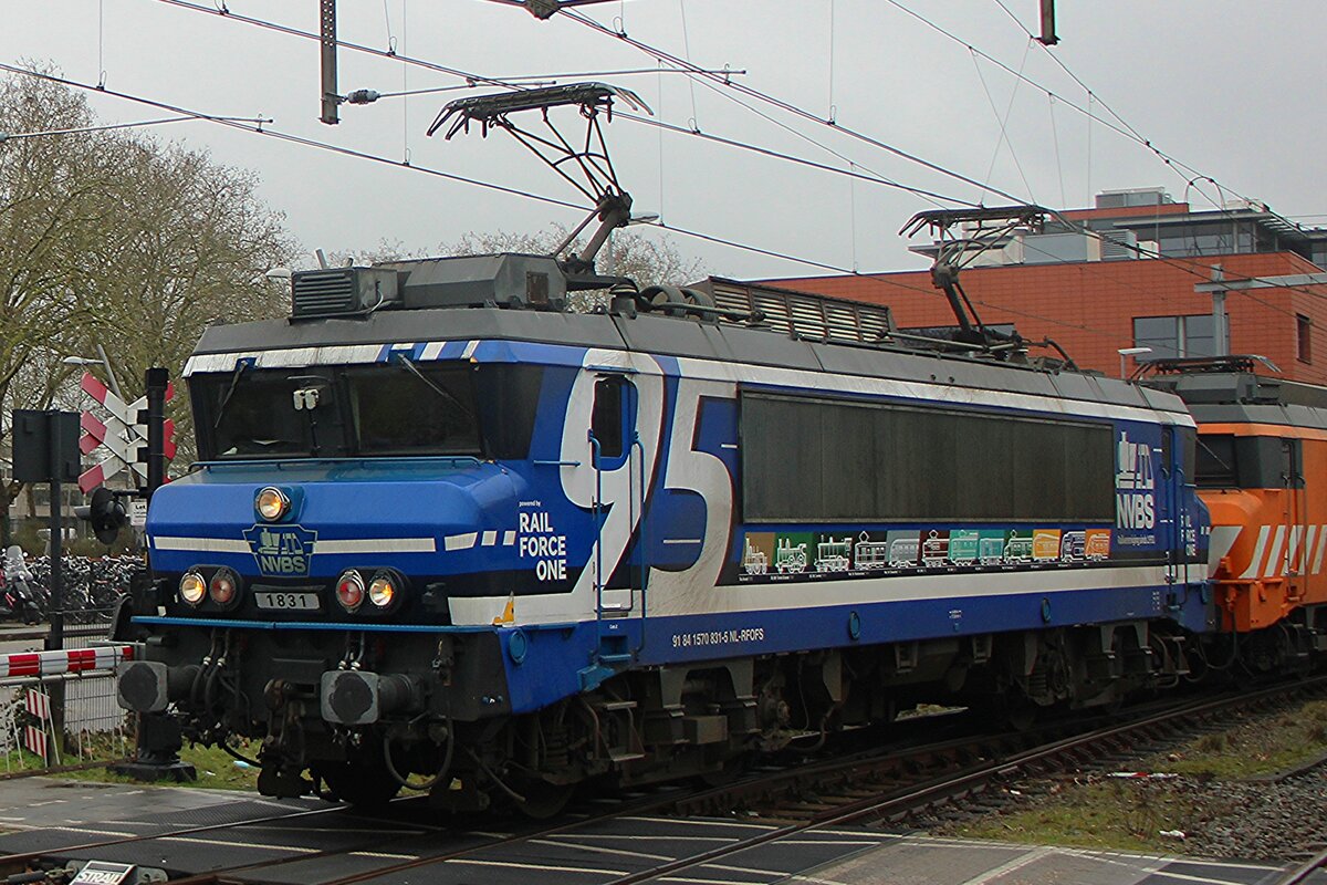 RFO 1831 steht am 11 Februar 2026 in Oss und gratuliert der Fangemeinde der NVBS (Nederlandse Vereniging voor Belangstellenden in Spoor- en tramwezen). Dieser lok wurde 1984 als NS 1631 in Dienst gestellt und wurde 2001 umnummeriert in 1831. Loks der Reihen 1600 und 1800 sind ganz identisch und nür weil die Gutersprate von NS, NS Cargo, ab 2003 Railion, eine eigene Nummerung brauchte, wurden die 1626-1658 in 1826-1858 umgezogen, ohne weitere änderungen. Die 1831 bekam in De4zember 2025 dieser Lackierung für das 75.Jahresjubiläum der NVBS und sol mindestens ein Jahr in diese Farben rundfahren. Die 1600er/1800er können meistens auf die Strecke Amersfoort--Bad Bentheim gesichtet werden, mit einige Abstecker nach Oss oder Amsterdam Westhavens.