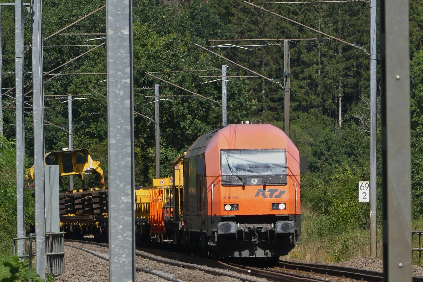 RTS Lok 2016 905 zieht den Gleisbauzug im Schritttempo über die Kurvenreiche Strecke zwischen Drauffelt und Enscherange. 23.08.2023
