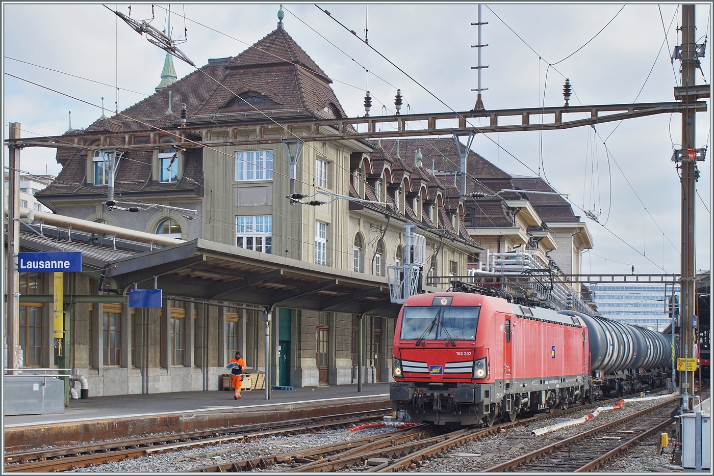 Die (ex DB) WRS 193 302 (91 80 6193 302-7 D-WRSCH) steht mit einem langen Kesselwagenzug in einige Zeit in Lausanne bevor ihre Fahrt weitergeht. Die Lok hat gemäss der Anschrift eine Zulassung in D, A, CH, I, NL und B, wobei praktisch an der selben Stelle angeschriebenen Spannungen für mich nicht schlüssig sind: 3000 V , 1500 V, 1500 V 50 Hz und 1000 V 16,7 Hz. Leider stand die Lok mit ihrem Zug fotografisch gesehen sehr ungeschickt, was hauptsächlich auf die Länge der Zuges zurückzuführen ist. (Richtige Kategorie?) 5. Januar 2026