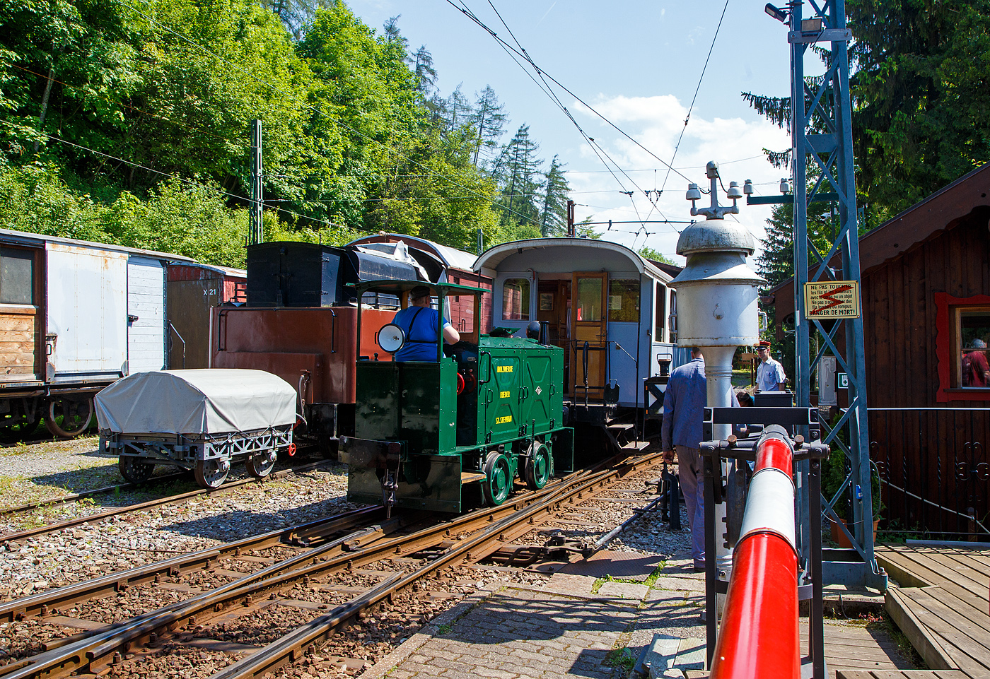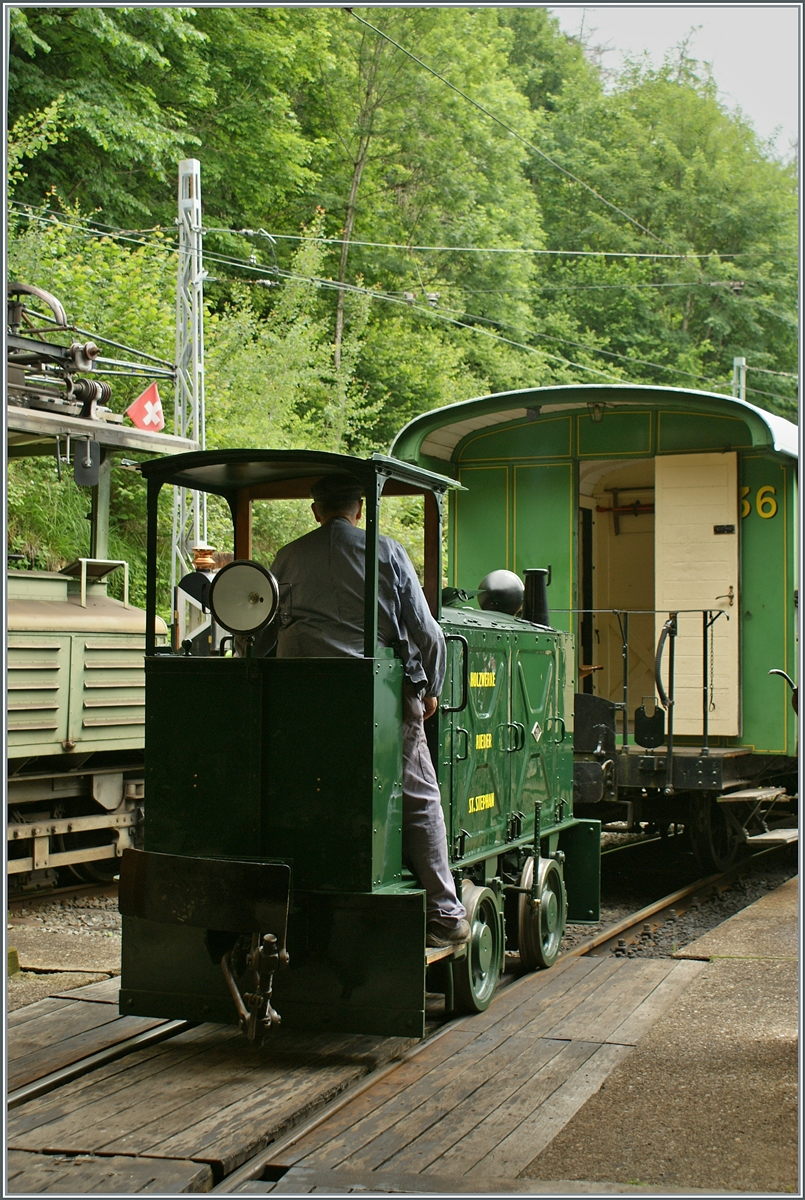 Ein weiteres Bild der MOB V 121 in Chernex, diesmal quer über die Gleise von Süden her. Ebenfalls ins Bild ragt eine der zahlreichen hier abgestellten MOB GDe 4/4 Serie 6000, die GDe 4/4 6003. Nicht zu sehen ist auf dem Gleis des MOB Tm 2/2 121 und hinter der GDe 4/4 6003 die GDe 4/4 6001, bei welcher bereits die Stromabnehmer demontiert sind.