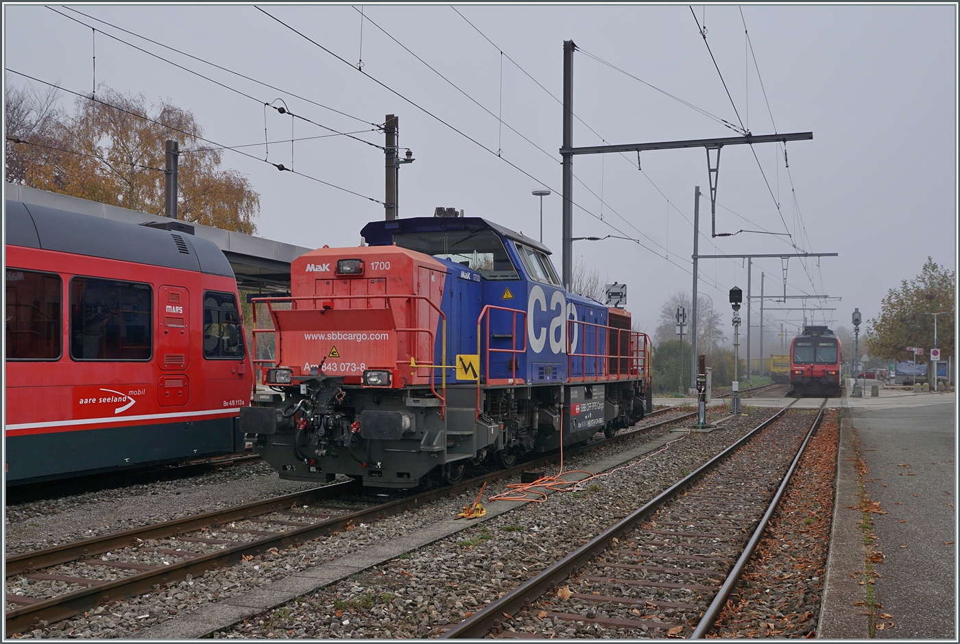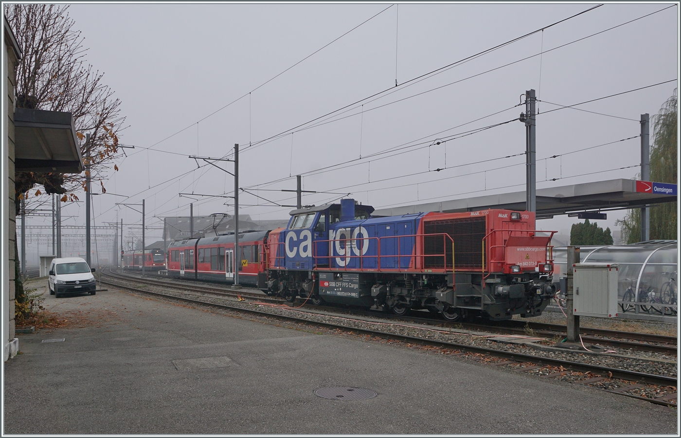 In Oensingen steht die SBB Cargo Am 843 073-8. Oensingen in verkehrstechnisch guter Lage verfügt über eine recht starken Güterverkehr, von welchem natürlich an diesem Samstag recht wenig zu sehen ist. 8. Nov. 2025