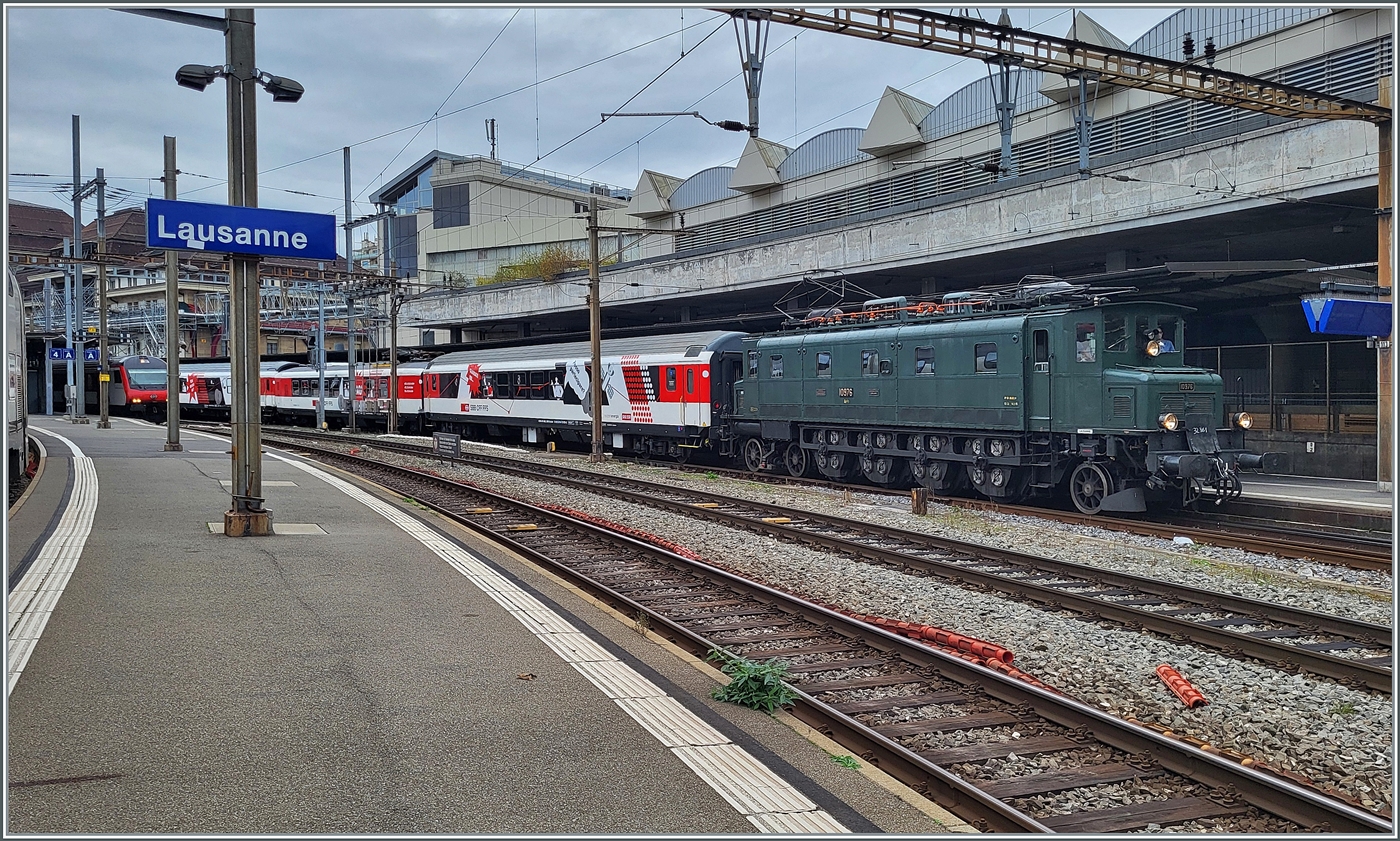 Auf Gleis 1 in Lausanne wartet die SBB Historic Ae 4/7 10976 mit ihrem Schulzug auf die Abfahrt. Die Lok wurde 1931 abgeliefert und stand bis 1995 im aktiven Dienst und wurde dann nach 64 Einsatzjahren als SBB Historic Lok aufgenommen. Der SBB Schulzug wird traditionell von "Altbauloks" befördert, die passen zwar eher wenig zum Zug, bieten aber die Gelegenheit, dass die Loks bewegt werden und Bahnfotografen sie verewigen können. 1. Nov. 2025