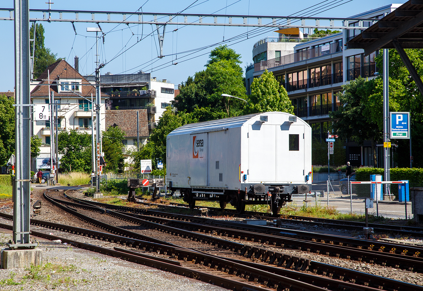 Der zweiachsige Materialwagen Vs 40 85 95 08 340-8 CH-SERSA der der Sersa (Rhomberg Sersa Rail Group) ist am 07 Juni 2015 beim Bahnhof Zürich-Tiefenbrunnen abgestellt. Es ist wohl ein umgebauter ex Bier-Kühlwagen der Gattung Ibqs.
