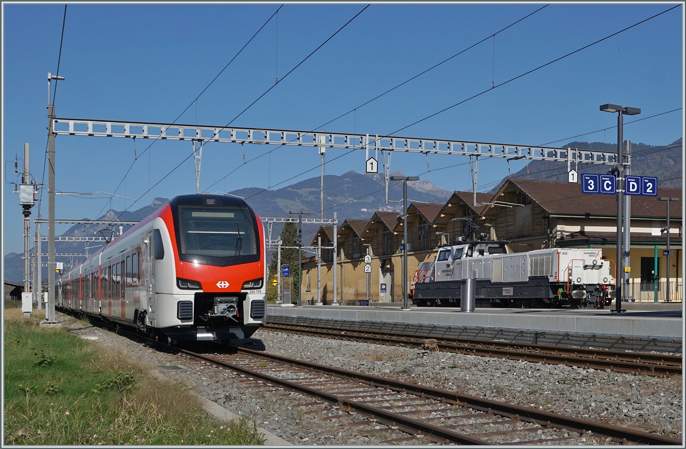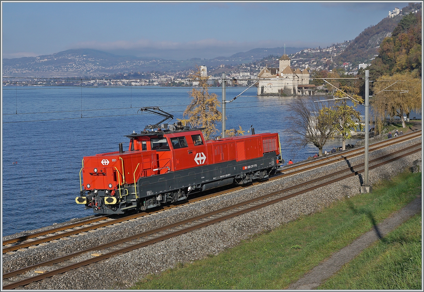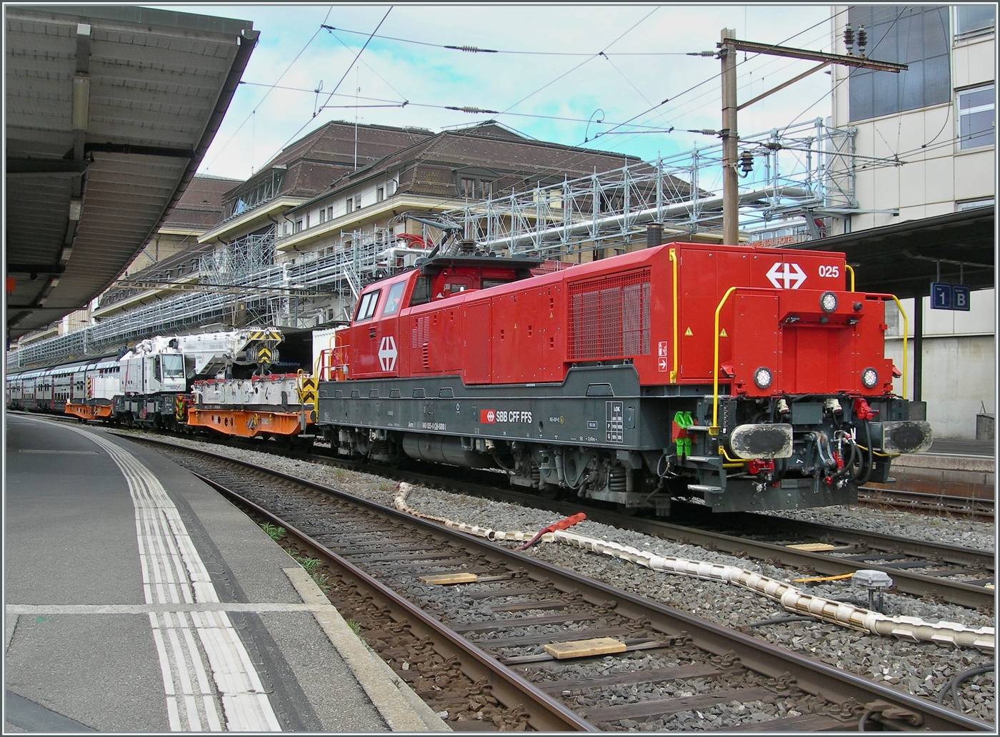 Die Aem 940 030-0 (Aem 91 85 4 940 030-0 CH-SBBI) der SBB Infrastruktur ist am 28. Mai 2023 mit einem Bauzug (Materialförder- und Siloeinheiten) beim Bahnhof Vevey.