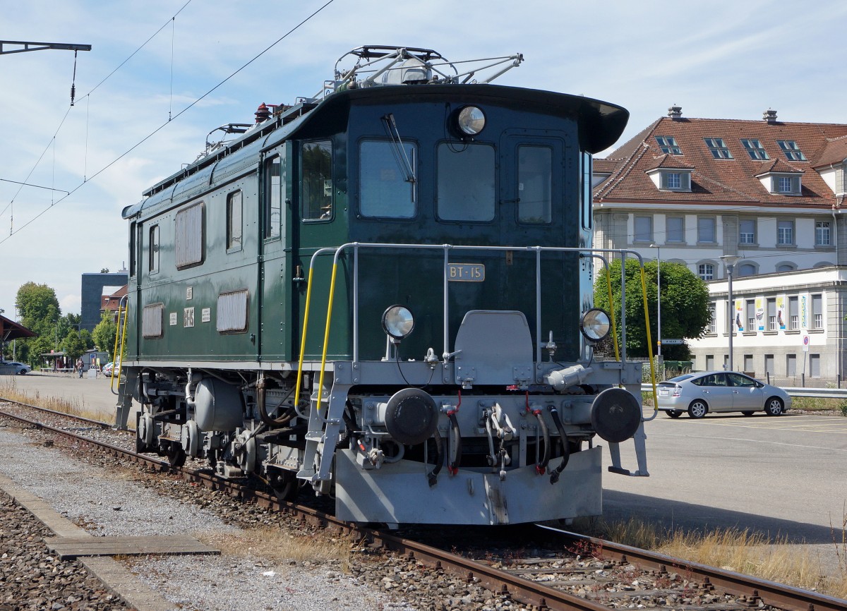 BDWM/DVZO/DBB: Ueber das Wochenende vom 26. bis 28. Juni 2015 verabschiedete sich die BDWM nach 140 Jahren vom Anschluss an das Europäische Normalspurnetz, weil durch die Aufhebung des Güterverkehrs auf normaler und schmaler Spur das Dreischienengeleise zwischen Wohlen und Bremgarten West nutzlos geworden ist. Mit dem WESCHTFÄSCHT und vielen Sonderfahrten nahmen Schüler und eine grosse Anzahl Festbesucher Abschied vom Dreischienengeleise auf diesem reizenden Streckenabschnitt. DVZO-Be 4/4 15, ehemals BT abgestellt in Wohlen am 26. Juni 2015. Mit dieser Lok wurde am 26. Juni 2015 die Eb 3/5 5810 in Konolfingen abgeholt und nach Wohlen überführt.