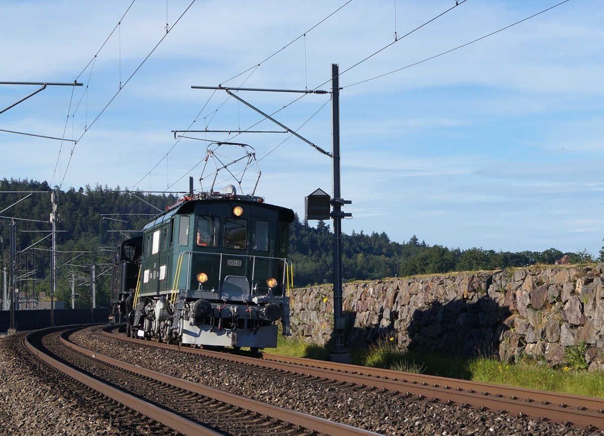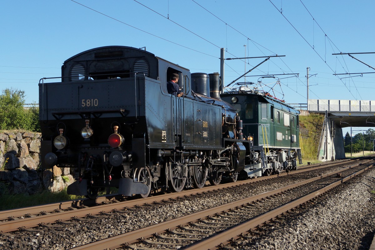 BDWM/DVZO/DBB: Ueber das Wochenende vom 26. bis 28. Juni 2015 verabschiedete sich die BDWM nach 140 Jahren vom Anschluss an das Europäische Normalspurnetz, weil durch die Aufhebung des Güterverkehrs auf normaler und schmaler Spur das Dreischienengeleise zwischen Wohlen und Bremgarten West nutzlos geworden ist. Mit dem WESCHTFÄSCHT und vielen Sonderfahrten nahmen Schüler und eine grosse Anzahl Festbesucher Abschied vom Dreischienengeleise auf diesem reizenden Streckenabschnitt. Am 28. Juni 2015 brachte die DVZO Be 4/4 15, ehemals BT die DBB Eb 3/5 5810  HABERSACK , ehemals SBB von Wohlen nach Konolfingen zur DBB zurück. Die Aufnahme entstand bei Roggwil im sommerlichen Abendlicht.
