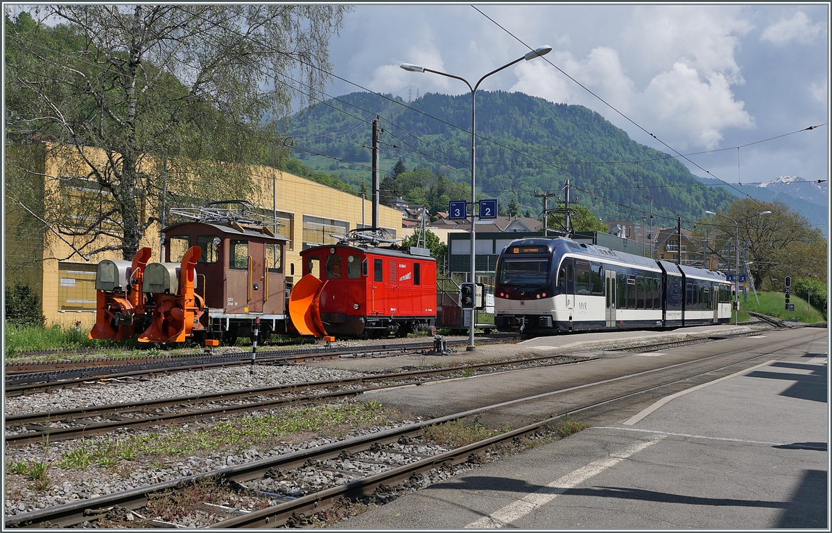 Als ich den CEV Xrot 91 undd die CEV HGe 2/2 N° 1 (und die hier nicht zu sehende HGe 2/2 N° 2) in Blonay abgestellt sah, fürchtete ich schon, dass die Fahrzeuge Blonay verlassen würden, doch in der Zwischenzeit sah ich, dass sie wieder im Lokschuppen untergebracht sind. 9. Mai 2022