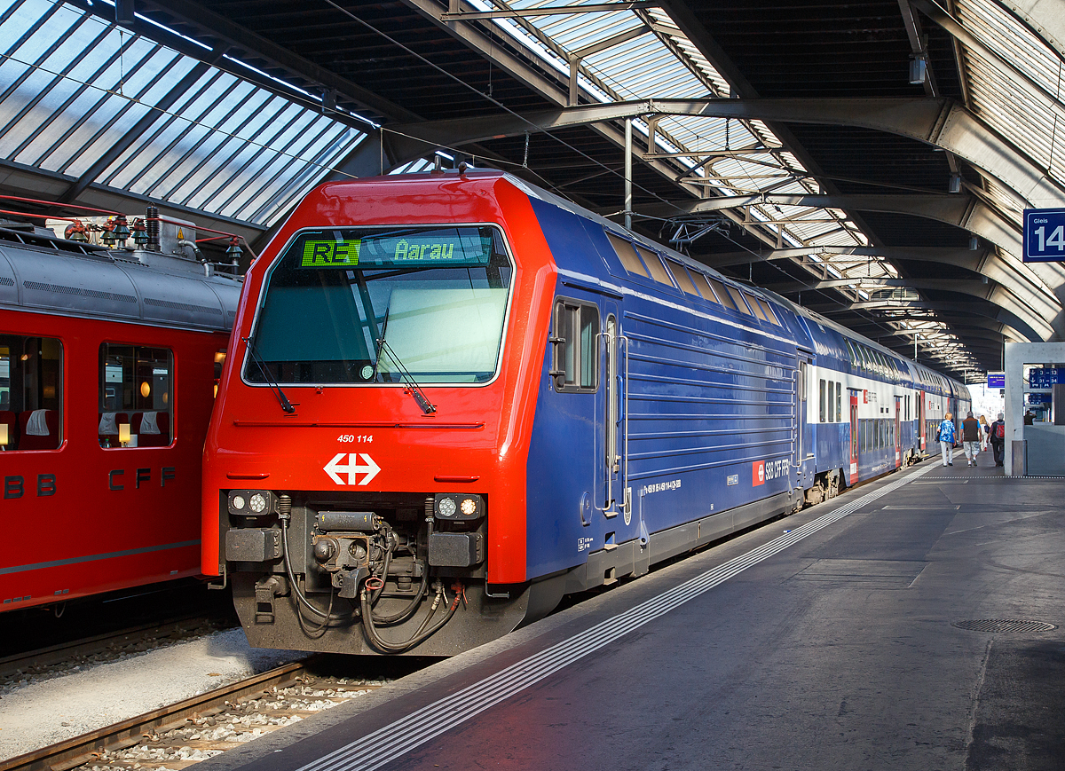 Die SBB Re 450 114-4 " Dänikon" (91 85 4 450 114-4 CH-SBB) steht am 06.Juni 2015 mit einen Doppelstock-Pendelzug der Zürcher S-Bahn als RE nach Aarau in Zürich HB bereit. Die Lok ist die letzte (Baujahr 1997) von 115 Stück gebauten Loks.