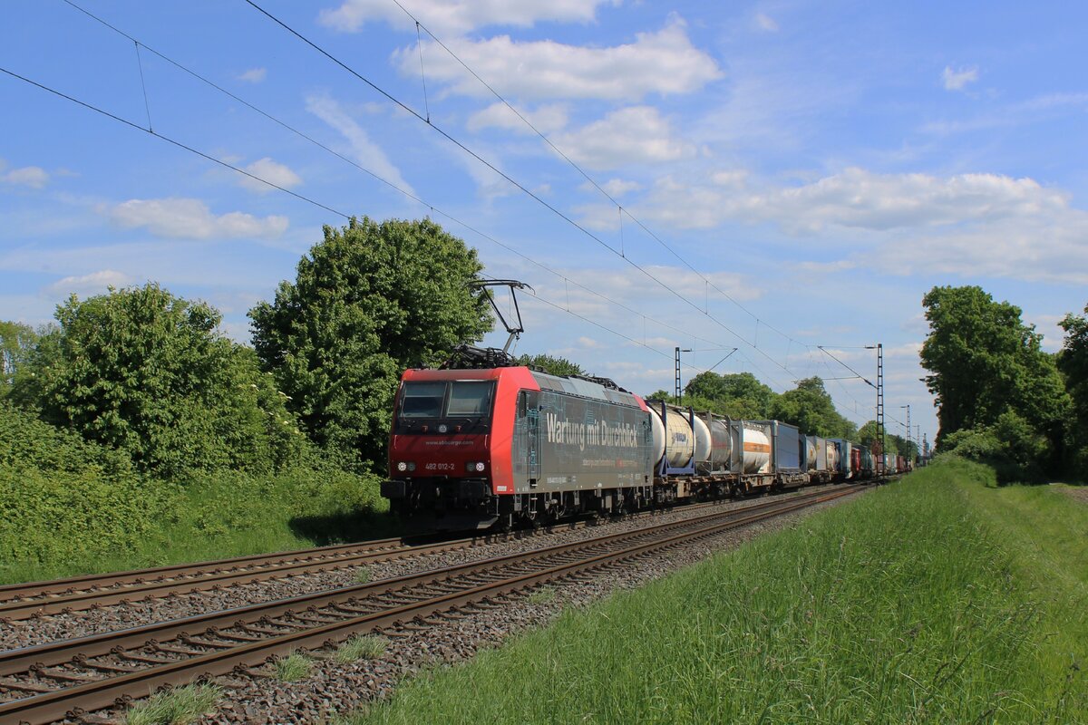 Am 8 Augustus 2025 schleppt SBB Cargo 482 013 ein Kesselwagenzug durch Kaarst-Broicherseite.